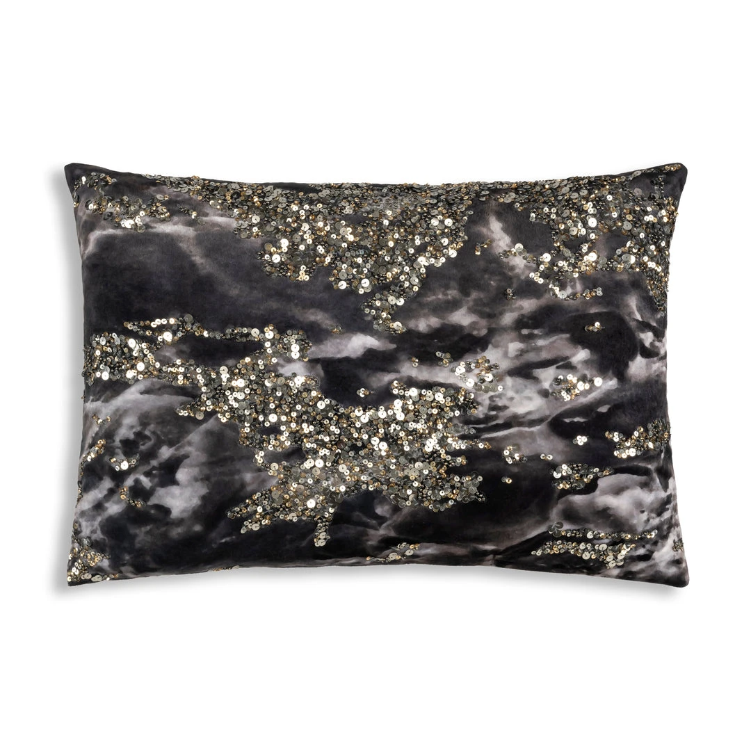 Digital Printed velvet oblong pillow with charcoal, gold and silver print and hand beaded in sequins and beads