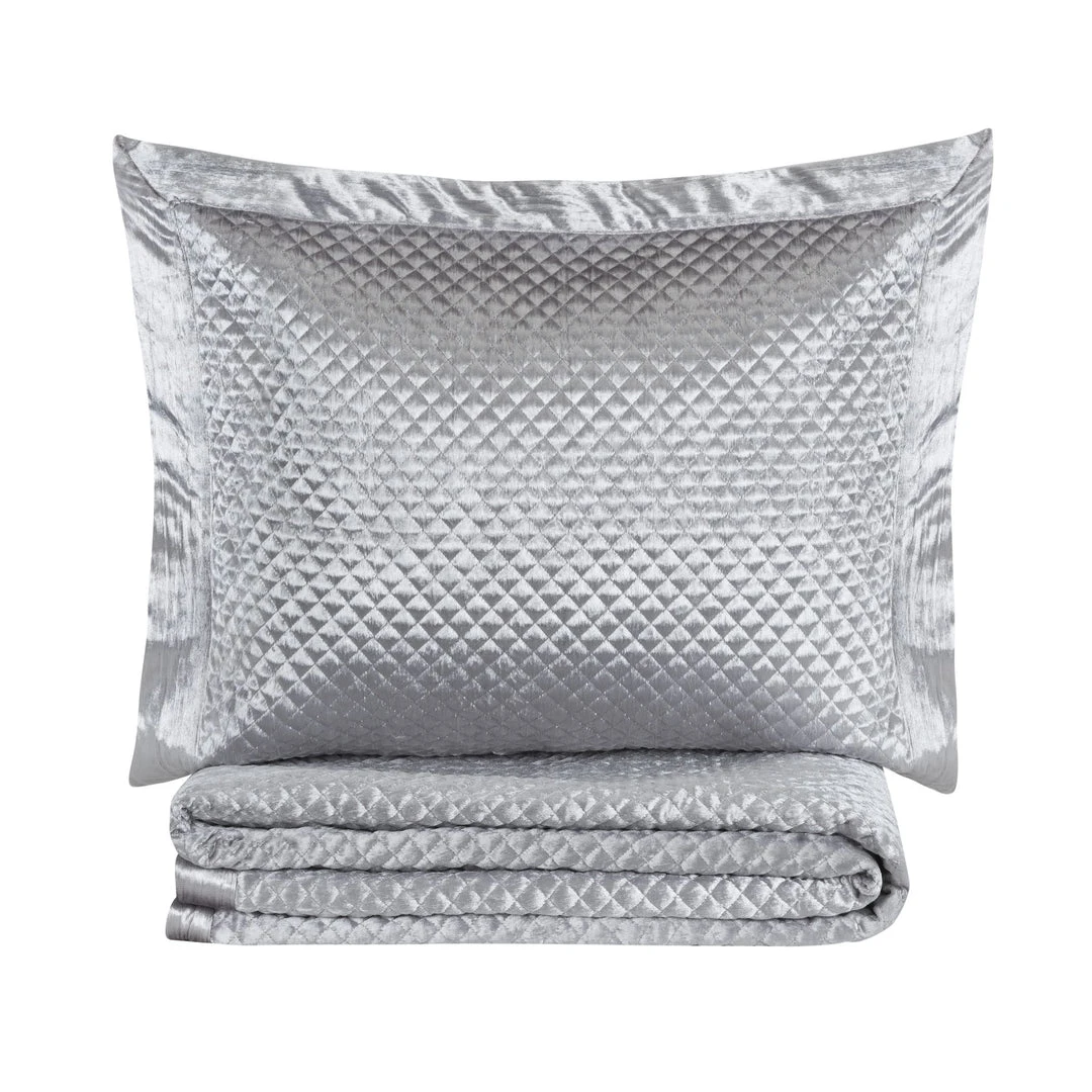 Dreams Collection- Light Grey Crushed Velvet with 1″ Diamond quilting with 2″ flange. Piping in Grey Velvet. Reverse- 100% Matching cotton