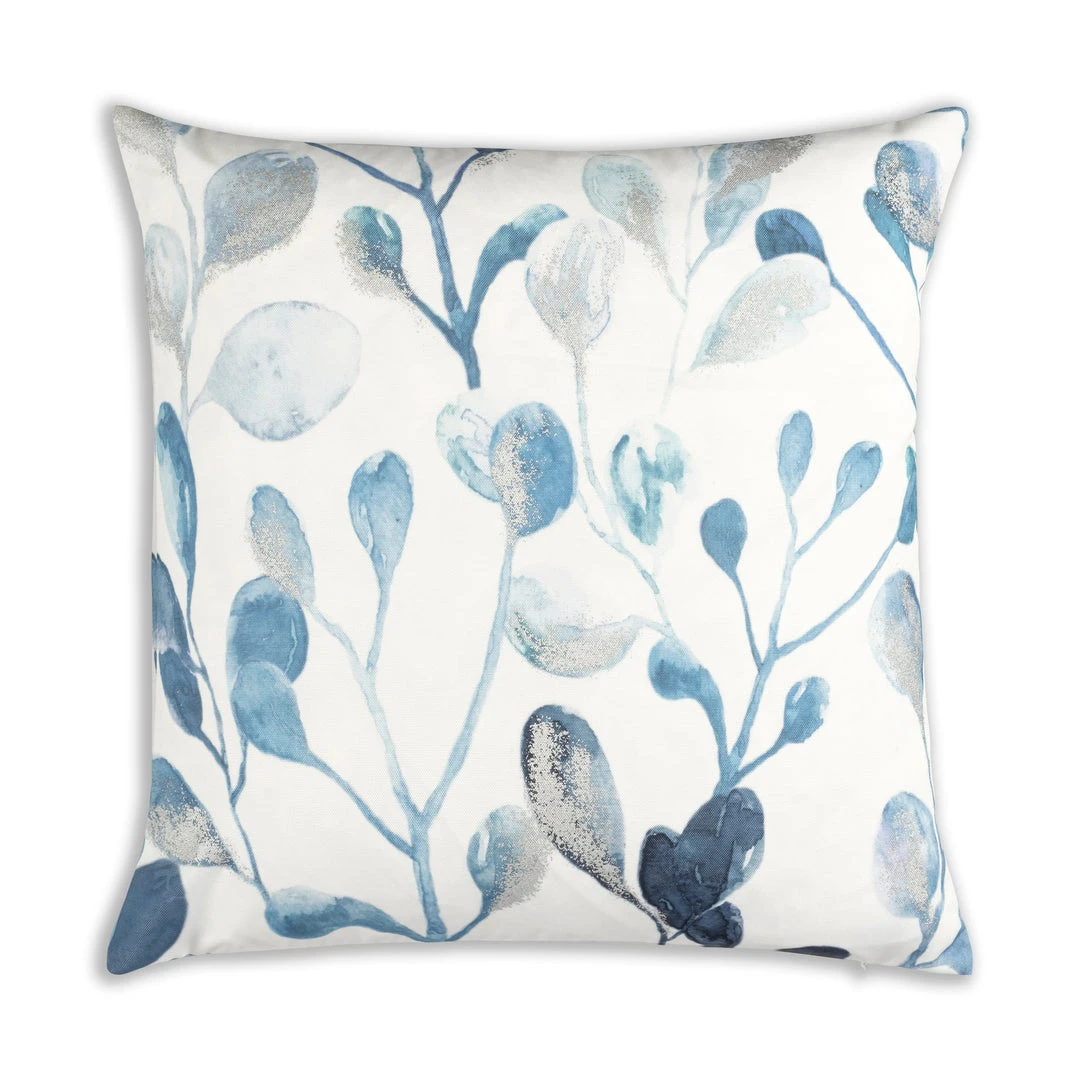 TSPUN Digital printed fabric in blues with outdoor rose gold metallic print. Outdoor compatible insert. Knife edge. 100% Polyester. Insert sewn in.
