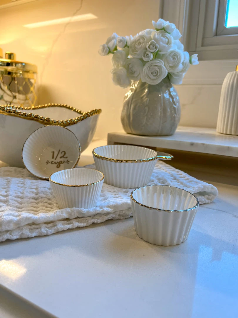 Description: These white and gold detailed measuring cups have a gorgeous gold trim and will add a touch of glam to your kitchen.