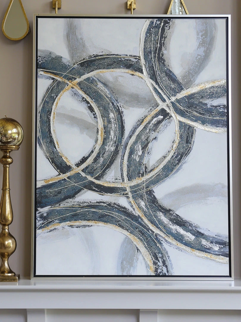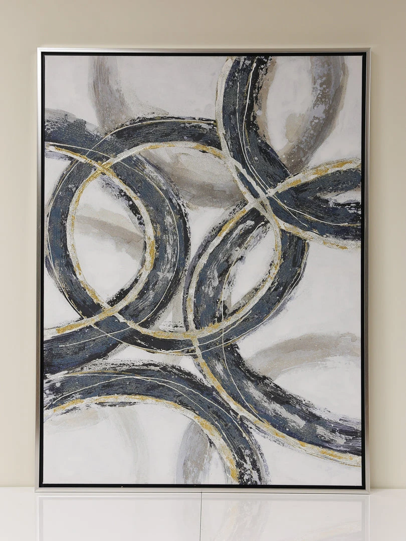 Description: This abstract oil painting has metallic accents of gold, black and gray to add interest to your wall.
