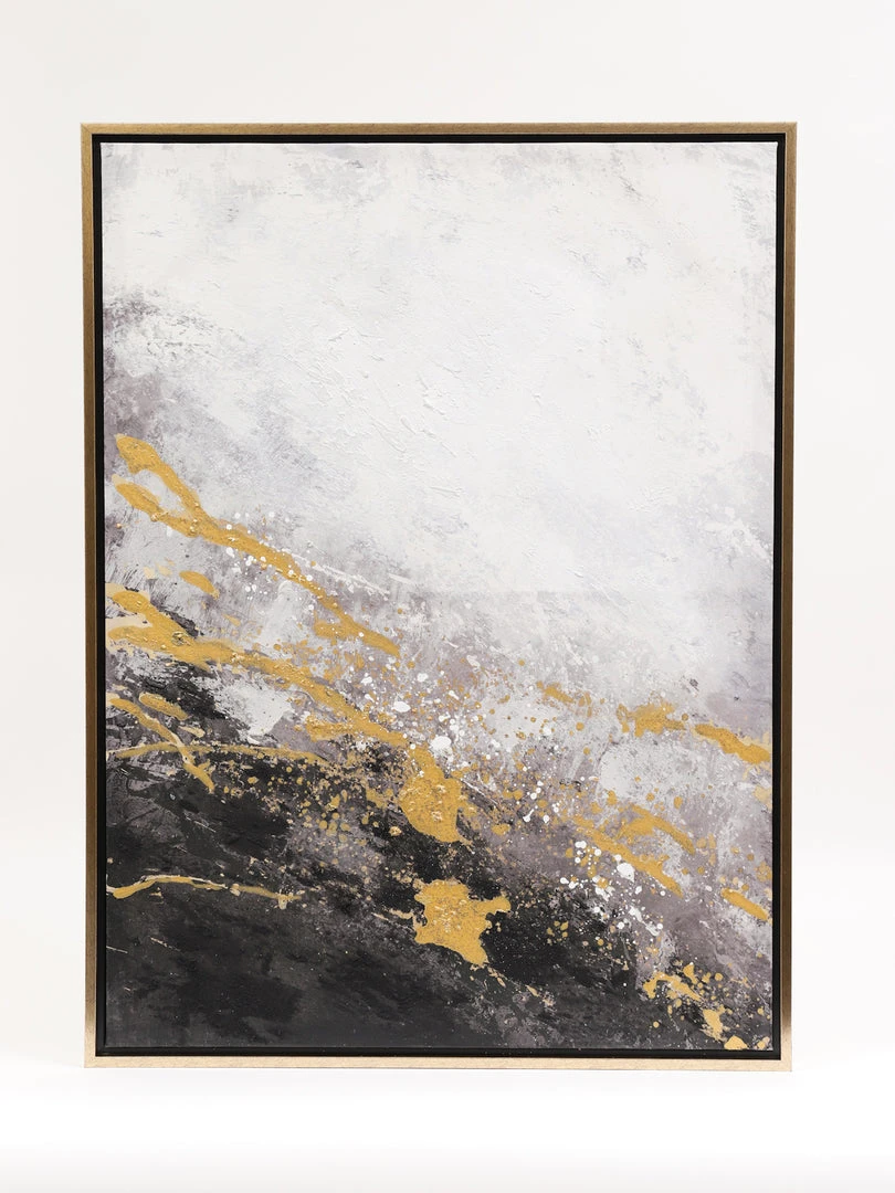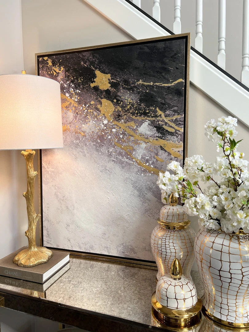 Description: This beautiful charcoal black abstract wall art has streaks of metallic gold, shades of gray, black and white within a gorgeous gold frame is simply stunning!