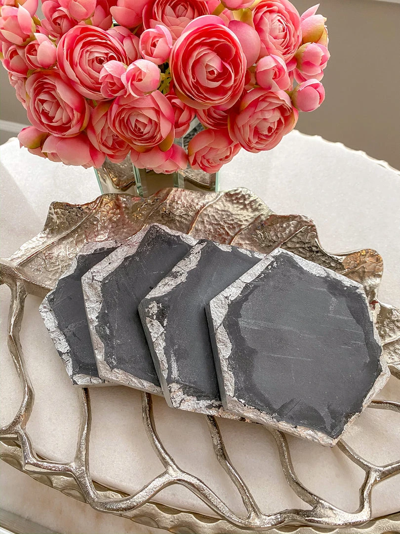 Description: These beautiful charcoal grey marble hexagon coasters are a perfect accent for your coffee table! Complete with a hammered texture edge and a metallic finish!