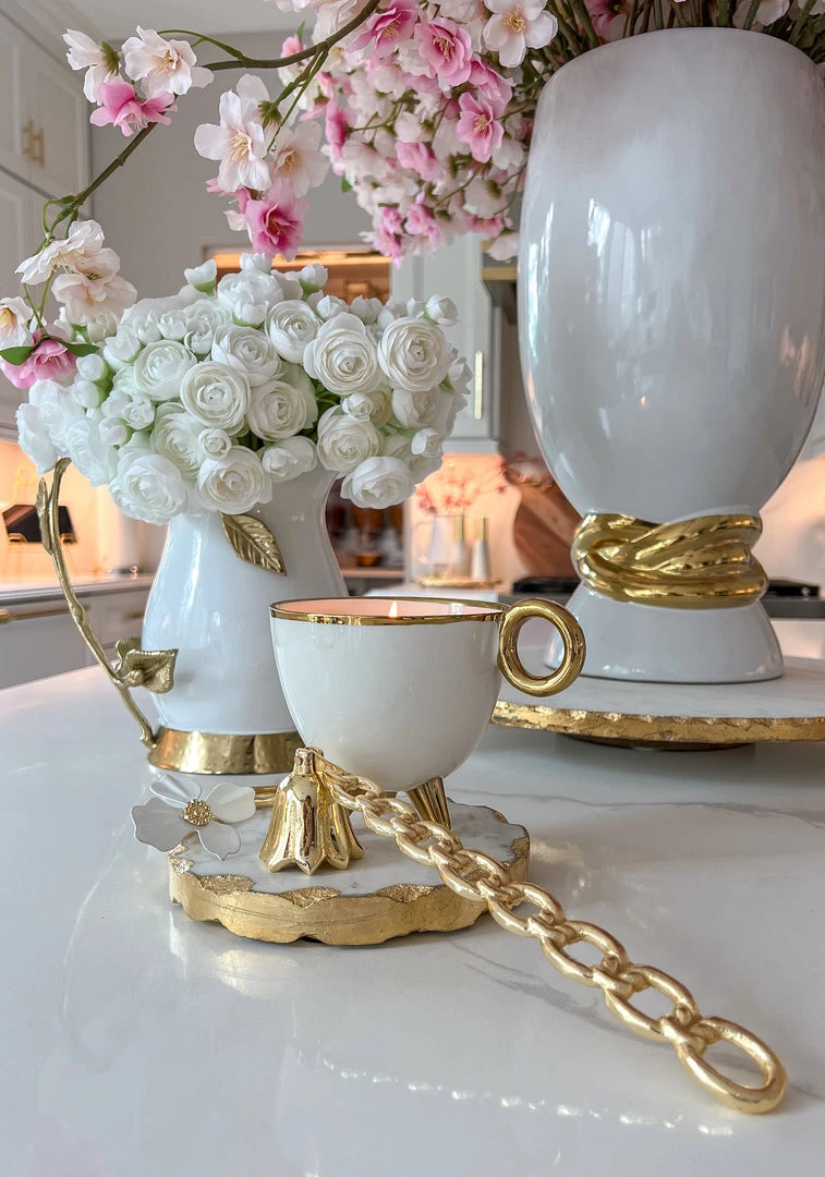Description: This is one gorgeous white and gold mug filled with a coffee-scented soy wax. This smells so amazing! You are going to want one for every room!
