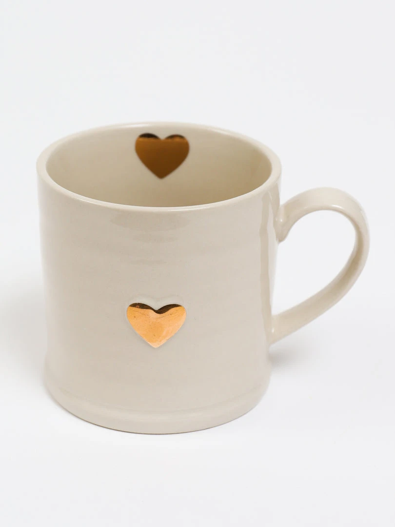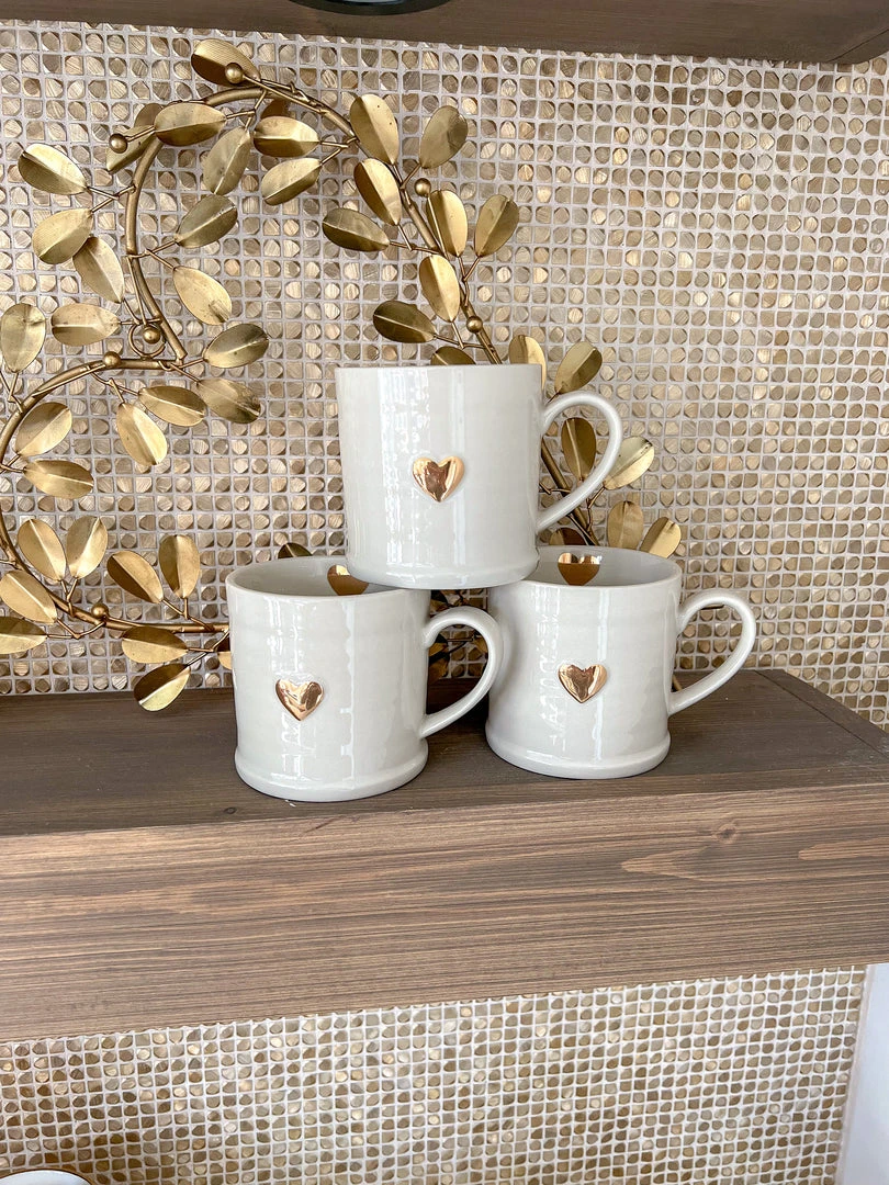 Description: The cutest ceramic beige sweetheart mug you’ll ever see. We love the gold heart on the outside and inside rim. This is sure to become a favorite.