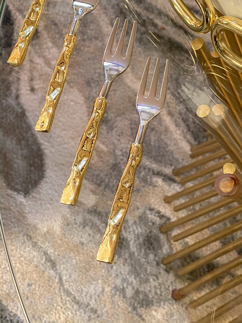 These elegant forks are perfect for snacks and match our Crumpled Gold Handle Spoons and Servers.