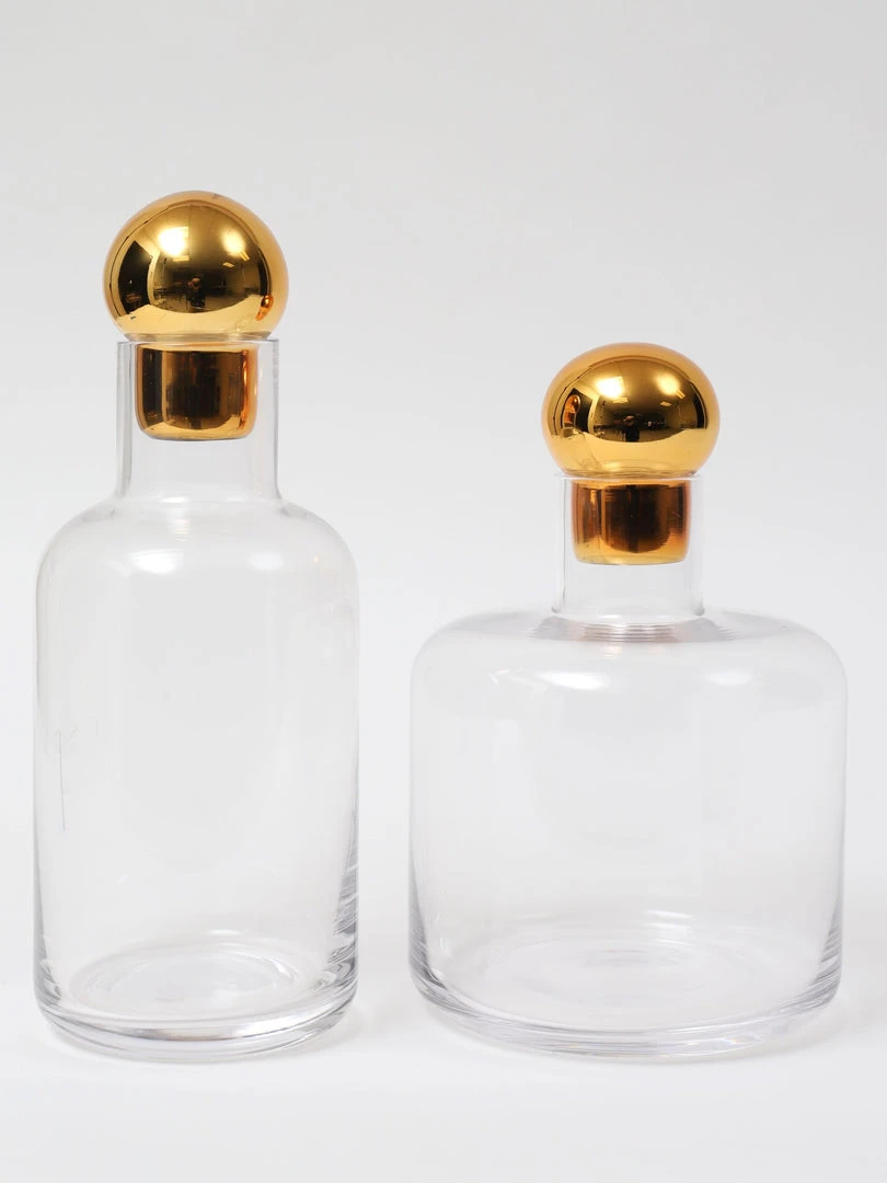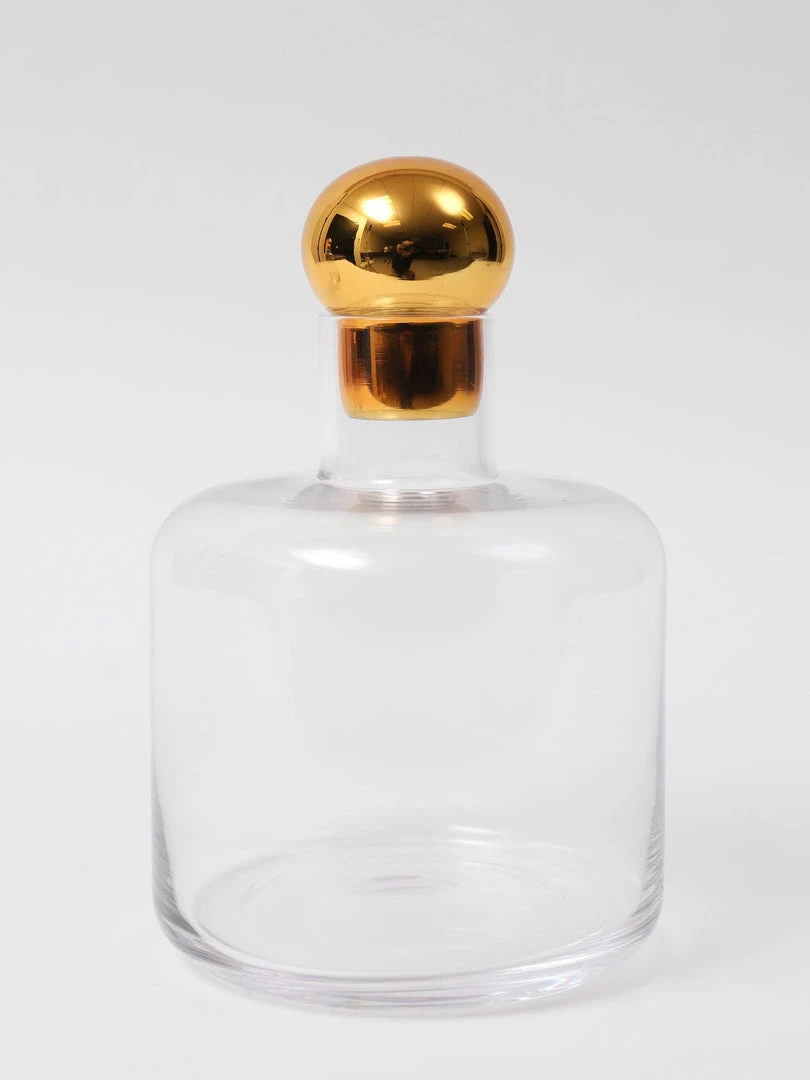 Description: This elegant glass decanter is a simple yet stylish piece! Topped with a round gold stopper, this is a simple way to add some glam to a room.