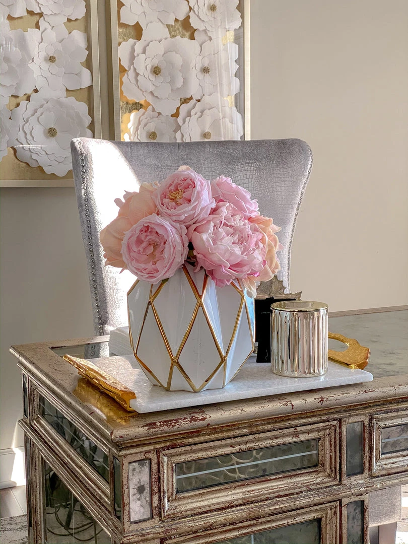 Description: This geometric white and gold vase is a classic modern design. Sleek and smooth edges are exaggerated by the glossy gold lines to make it a truly stunning piece.
