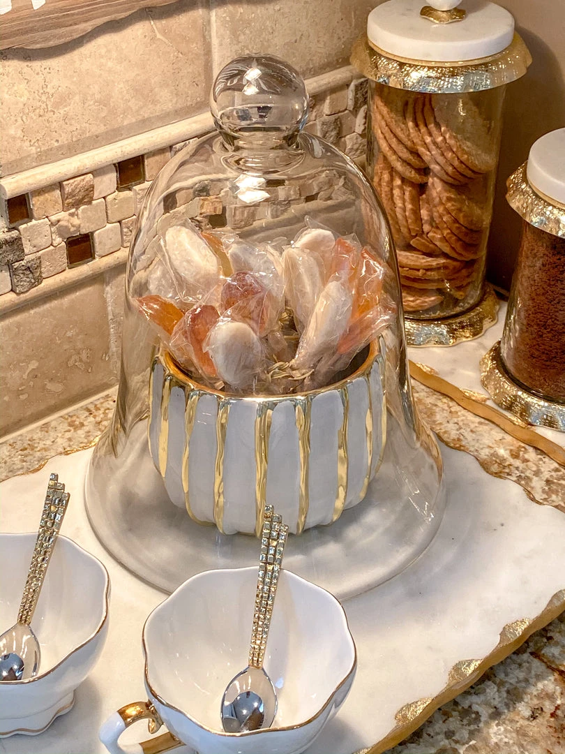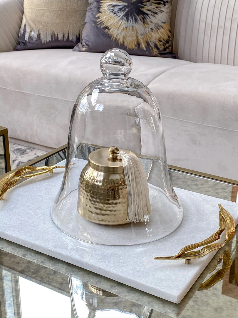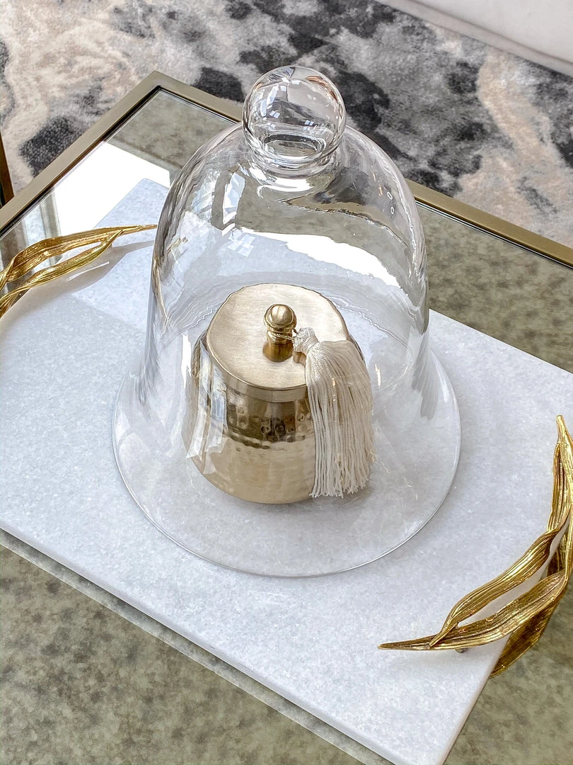 This bell shaped clear glass cloche is a cute way to compliment your favorite candle in your vignette!