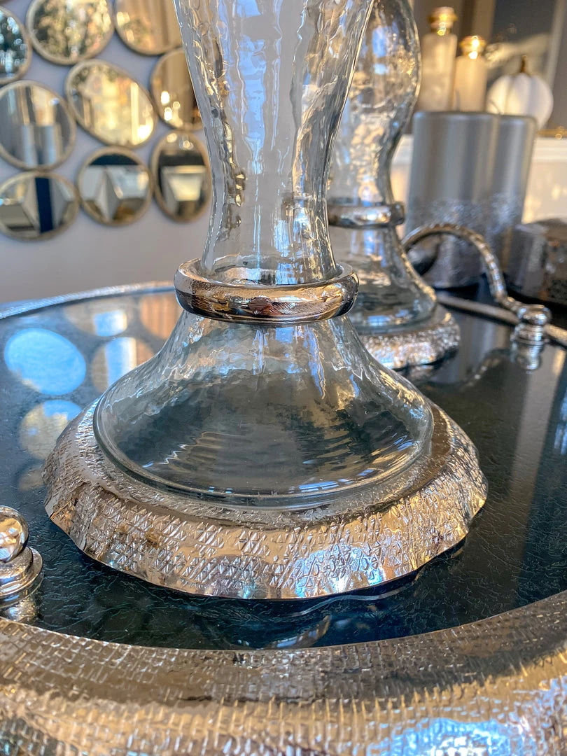 These glass candle holders feature stunning silver ruffled metal for an elegant look all year round.