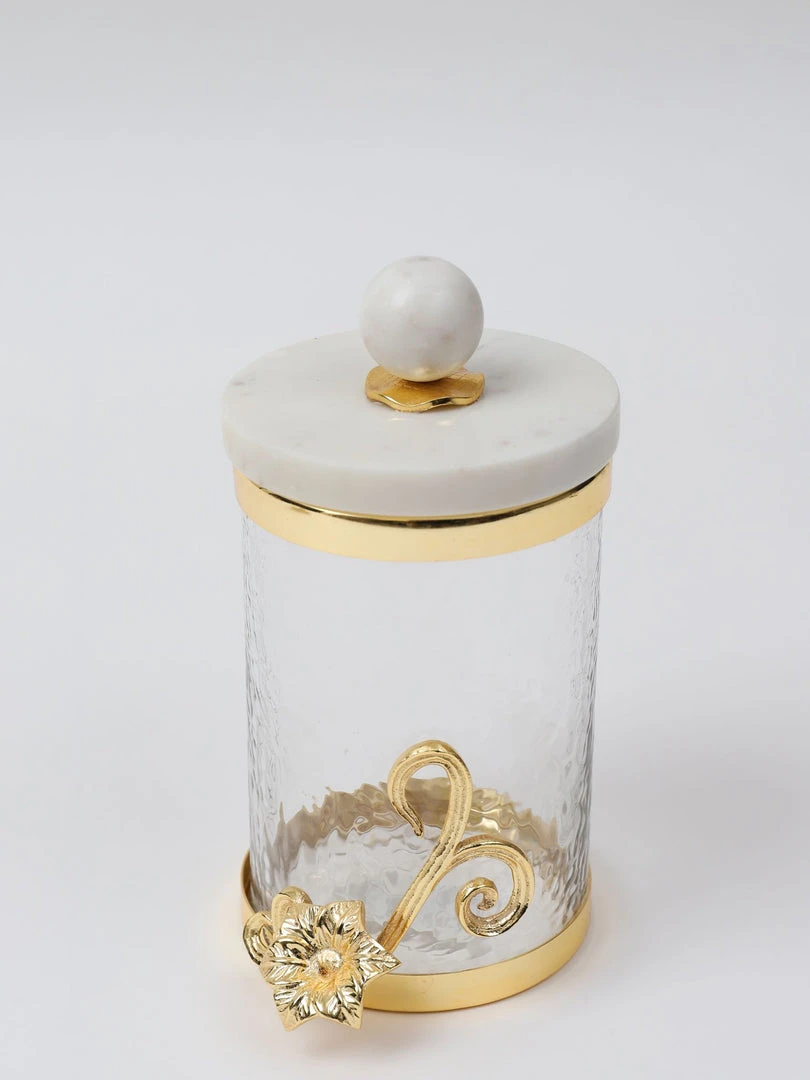 Description: These beautiful glass canisters have a golden flower design and a marble top with a gold accent. What a stunning way to showcase on your coffee station, kitchen counter, or anywhere you need storage. These would look fabulous in your bathroom as well.