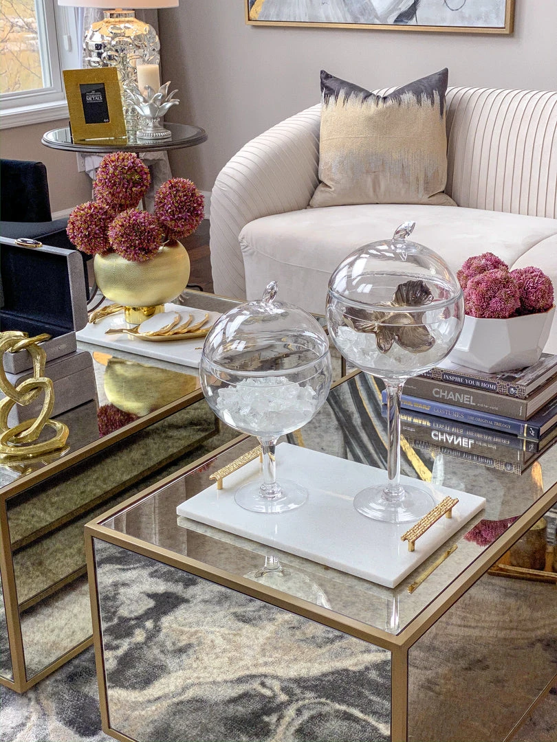 These apple stem jars can be styled as a set or on their own. They can be filled with candy, snacks, or even left empty! Farah has them styled with beautiful crystal stones and crushed gold glass!