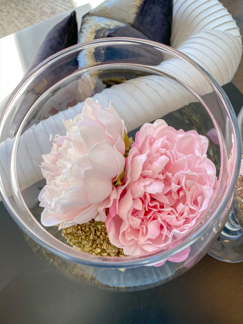 Description: New by popular request, we are offering pre-made home decor styled bundles! Each bundle follows a specific theme and style, and includes all the items listed above! The Glass Stem Jar Bundle is perfect to style that large space in your home! This bundle comes with the large and oversized glass stem jar, gold crushed glass fillers, and our pink and cream peony stems (2 of each color, 4 stems total). This bundle offers the perfect balance between texture and color, bold and delicate, and elegant but unique. We love this style, and we are confident you will love how this looks in your home!