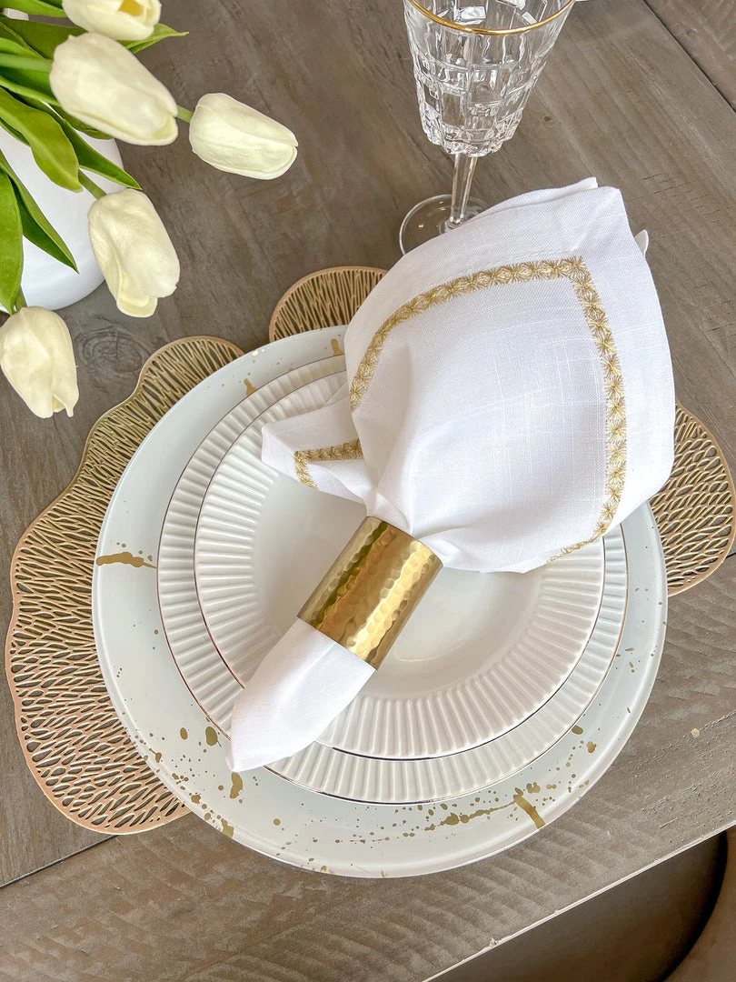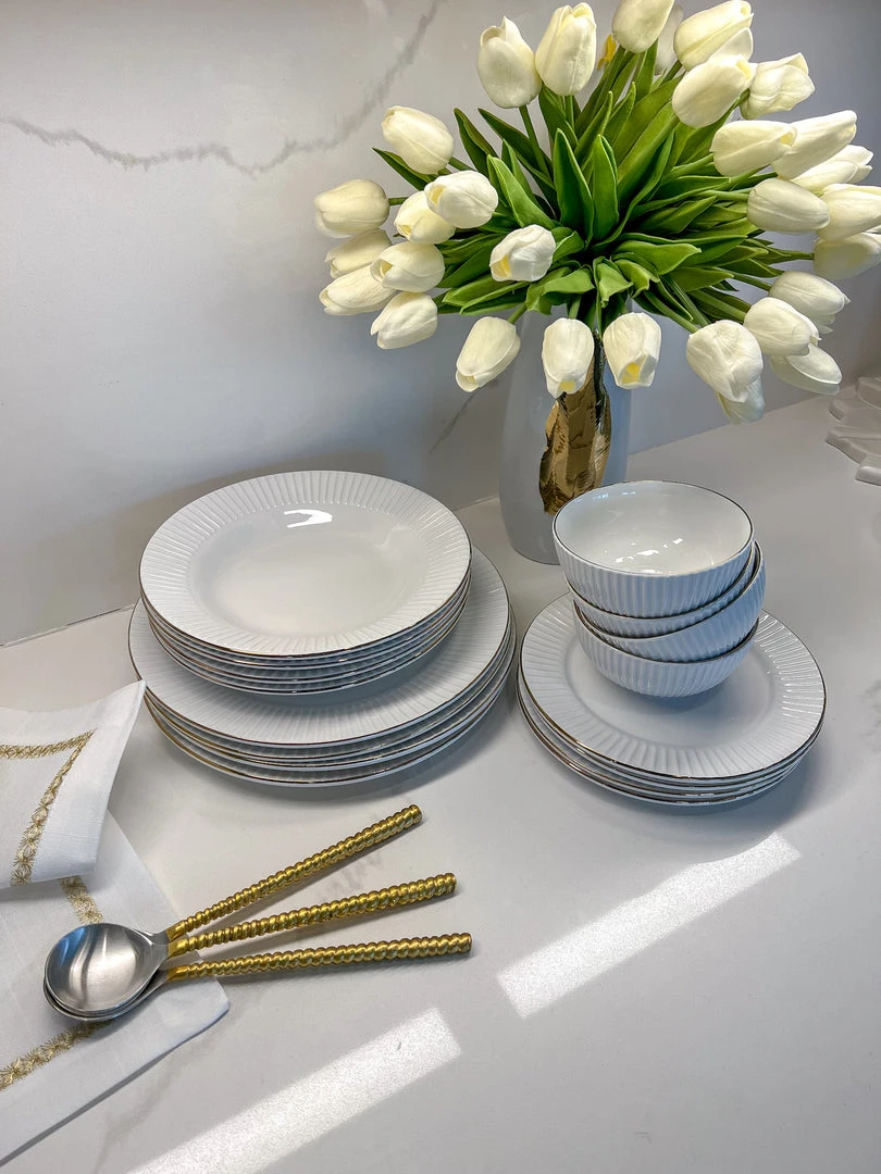 Description: This dinner set features a linear ripple texture with a gold border. It includes 4 sets of dinner plates, salad plates, salad bowls, and soup bowls.