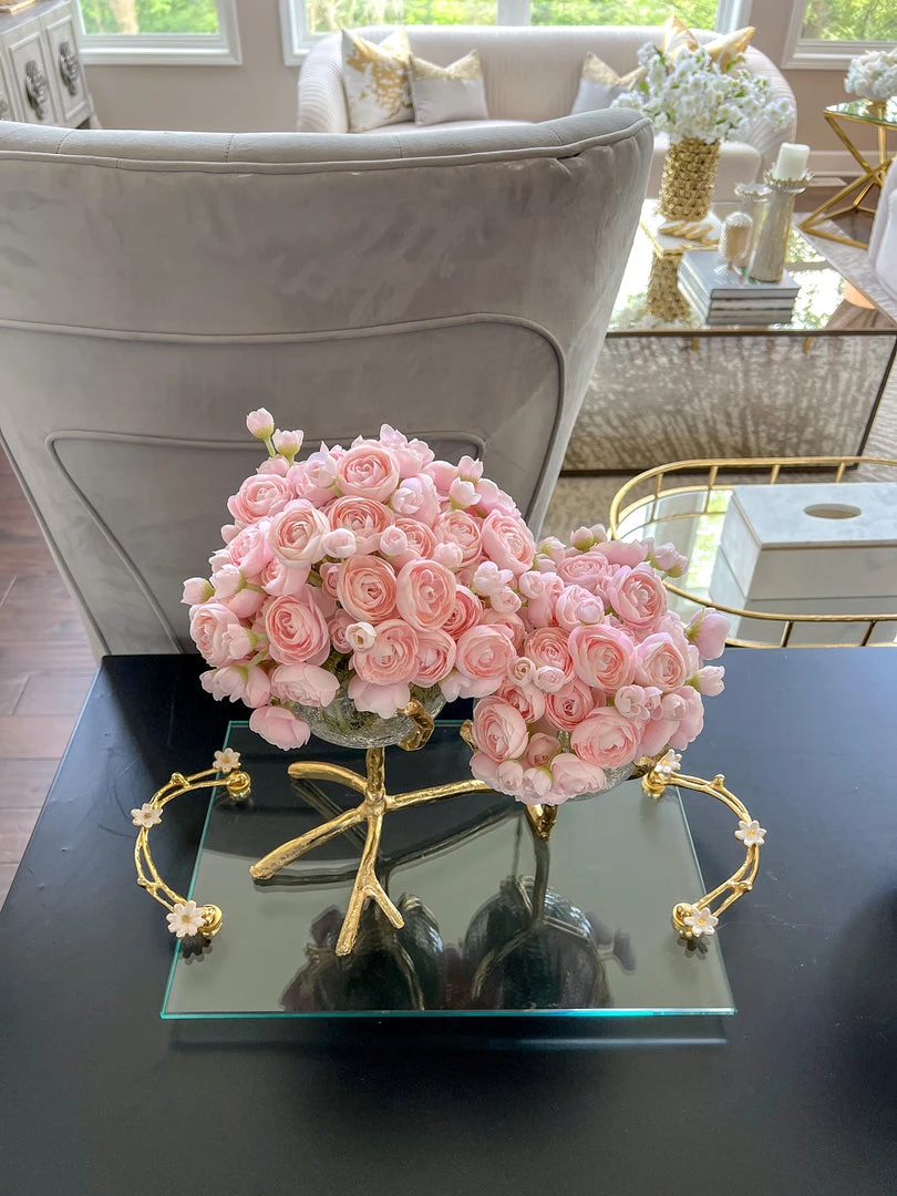 Description: The gold branches cradle two crackled glass bowls which can hold a tealight or votive candles or you can fill them with your favorite faux floral.