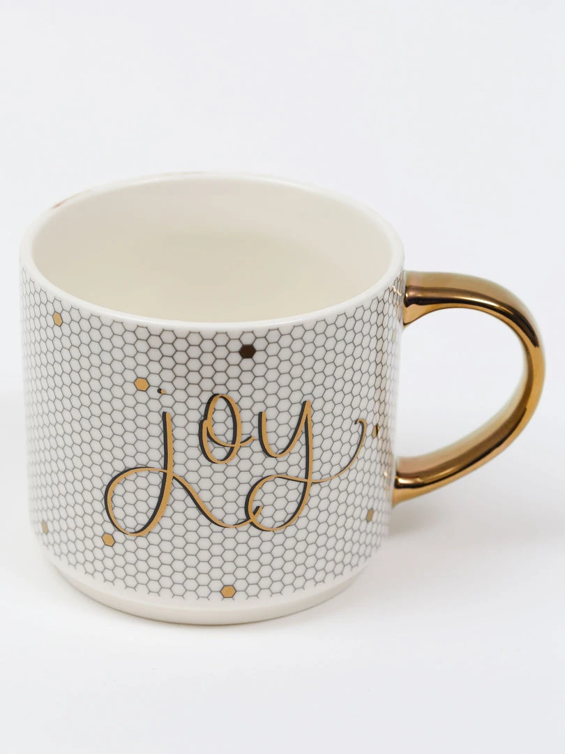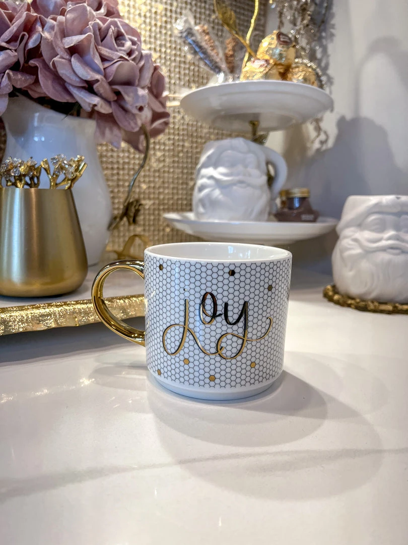 Description: This white with speck of gold dots and a gold handle is beautiful! A classic and timeless mug for every occasion.
