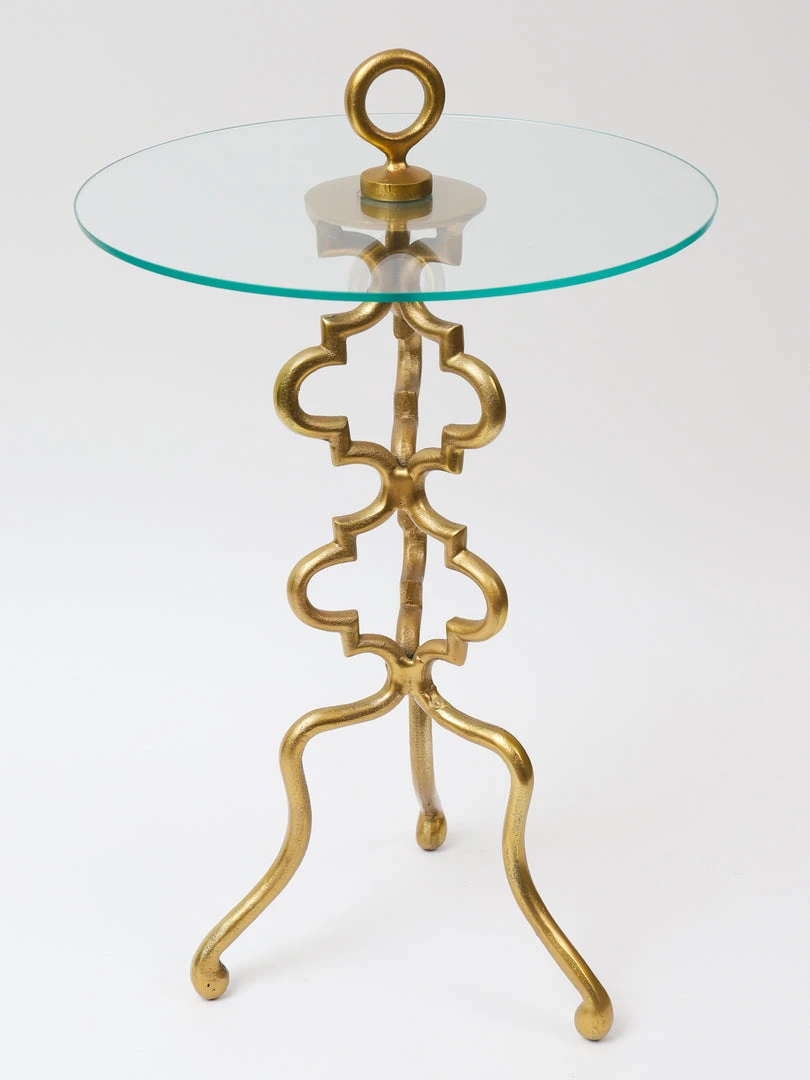 Description: This side table is so stunning! We love the intricate gold design of the base alongside the sleek glass top.