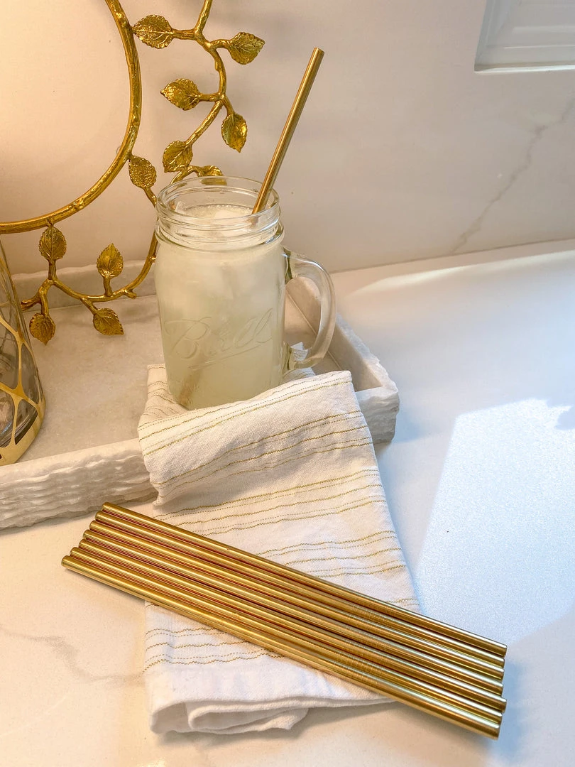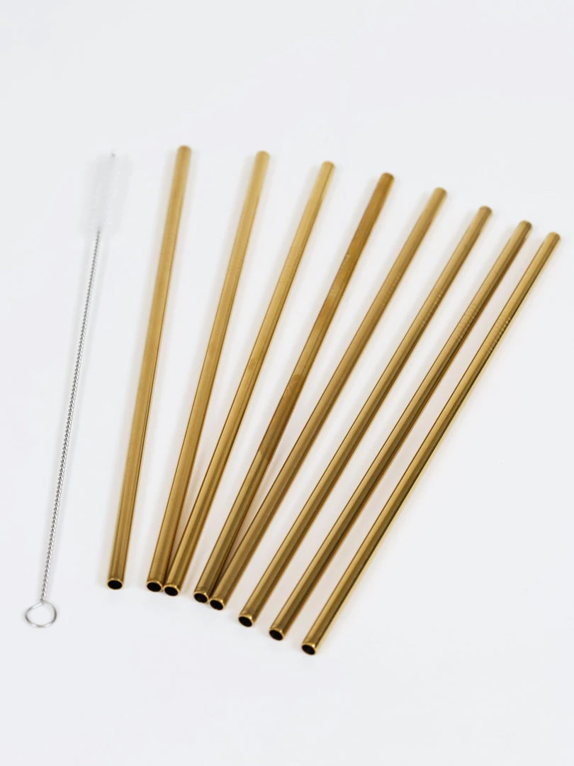 Description: This set of 8 gold stainless steel straws is great to use around your house and will help you do your part to help the environment! Includes a straw cleaner.