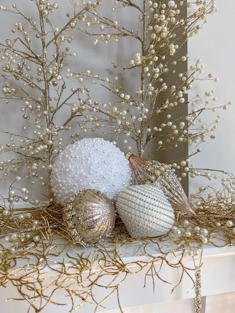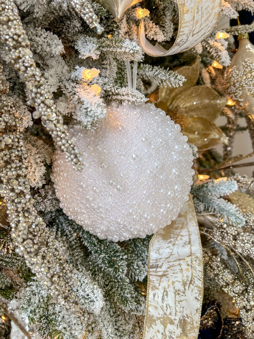 Description: This beautiful beaded white and pearl ornament is the perfect add on to your holiday tree! Available in two sizes. Priced for one ornament.