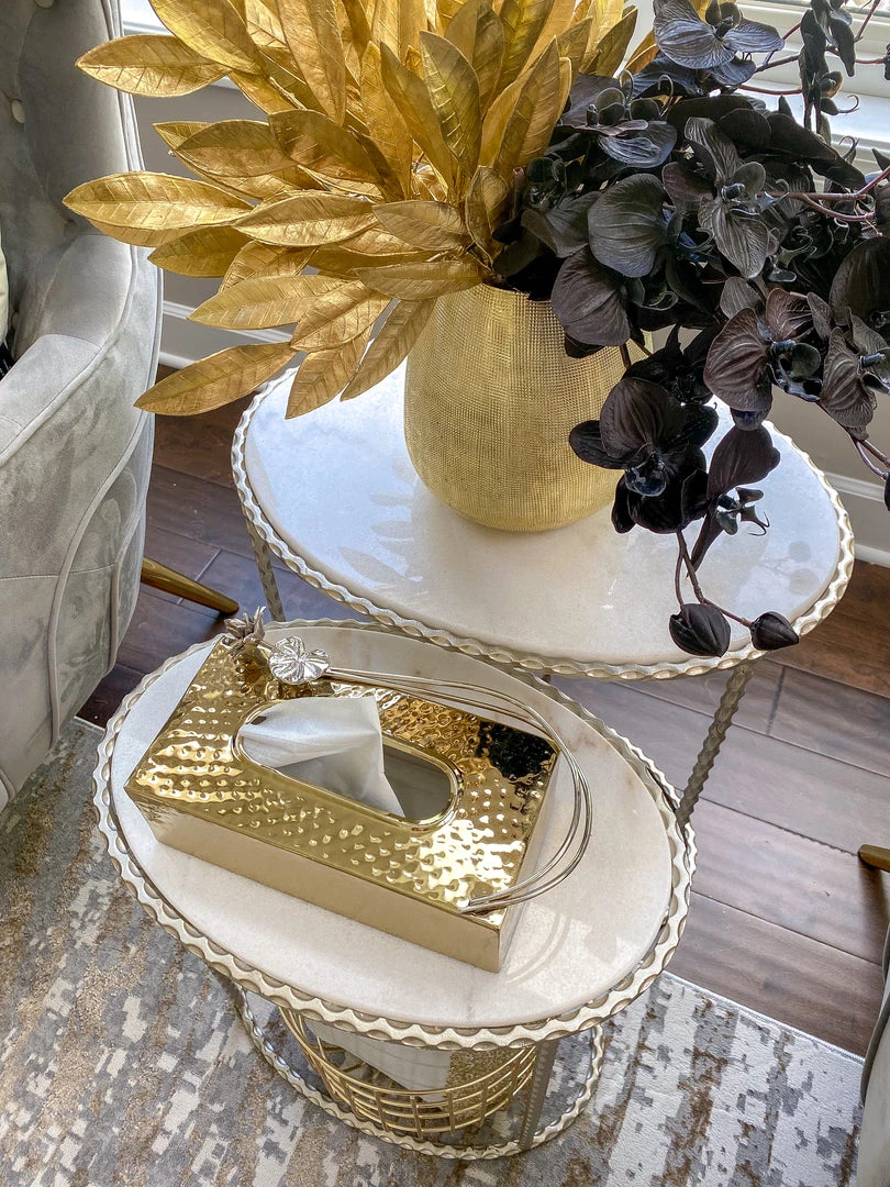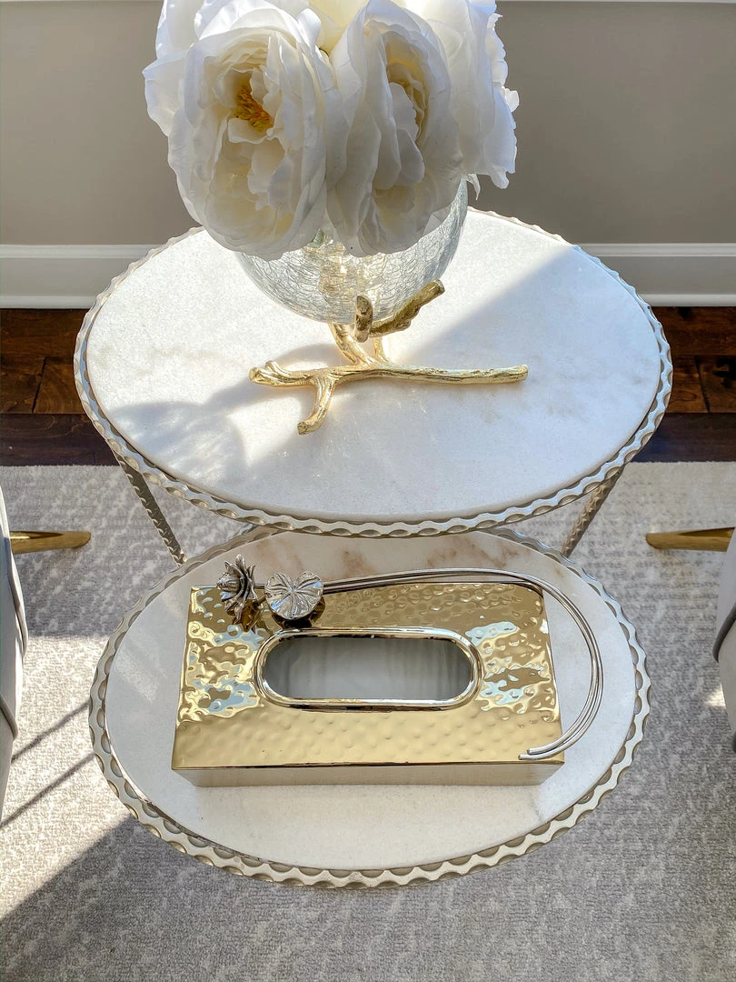 Description: This gold tissue box cover will hold and display your tissues while looking effortlessly glamorous.