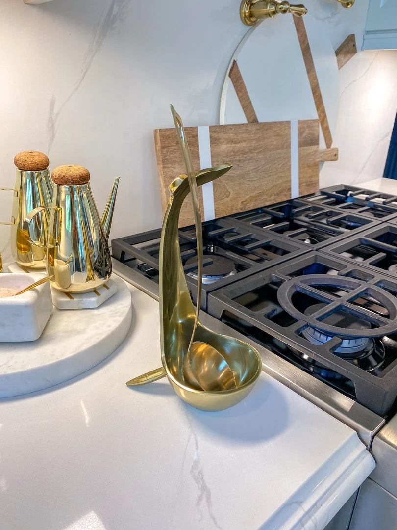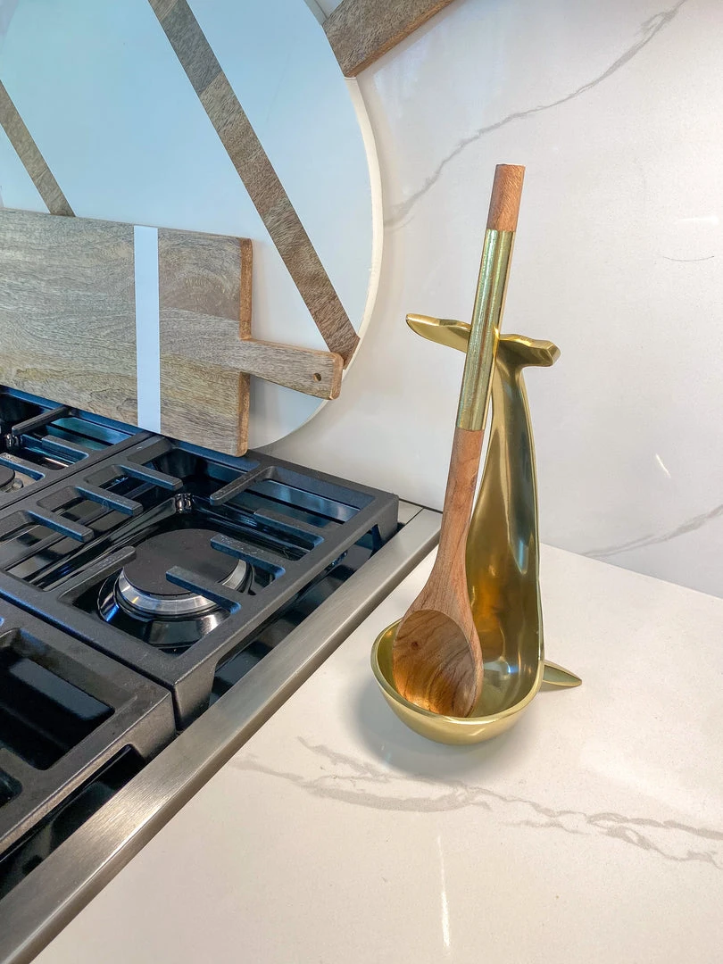 Description: This elegant gold whale tail holder is a perfect kithen accessory! Use it as a holder for your favorite bottles, a large spoon rest, or even as a decorative accent peice.