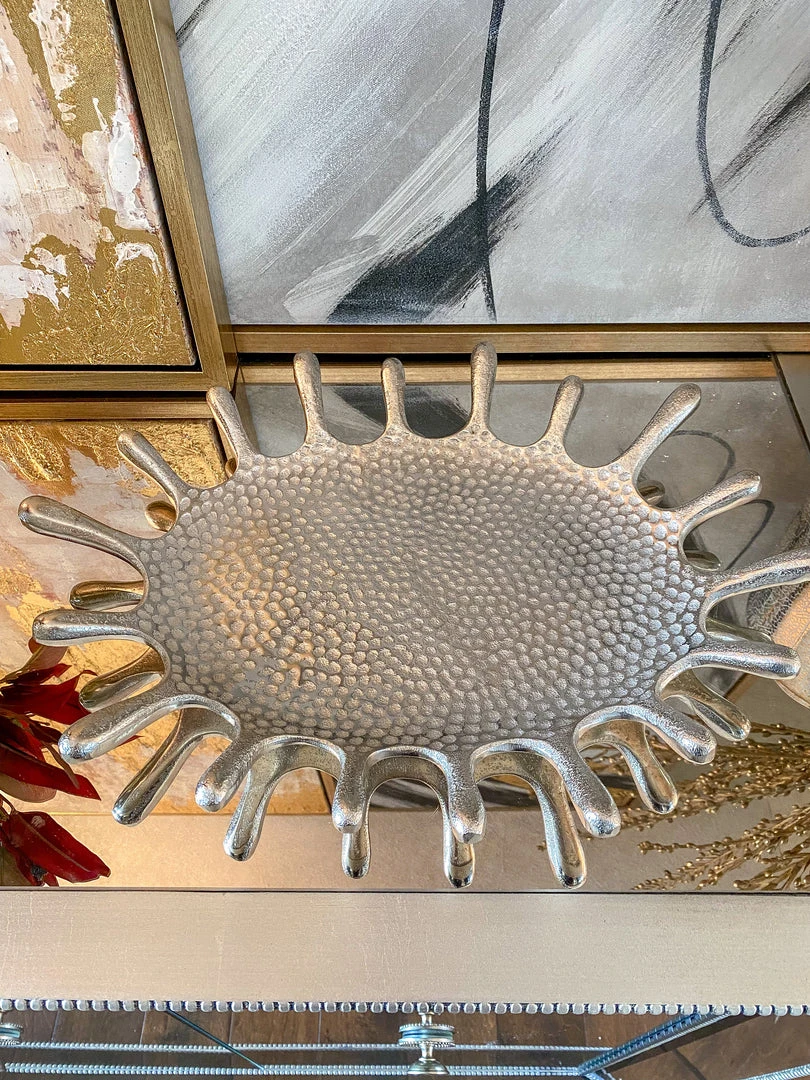 Description: This stylish tray features a unique splash design! Perfect to add a fun touch to your vignette! Available in silver and gold.