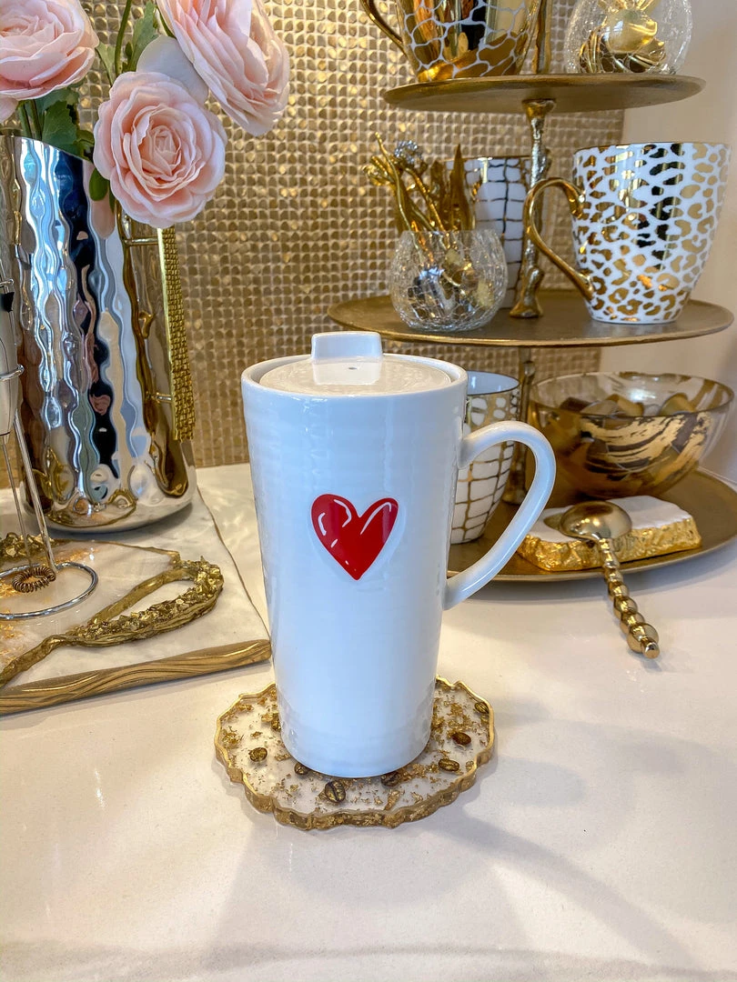 This lidded travel mug features the cutest red heart on the front and allows you to spread a little love wherever you go.