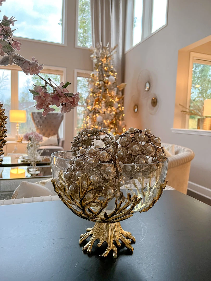 Description: This large glass bowl is perfect for displaying decor or serving meals or snacks! It features a beautiful gold branch base and the bowl is removable for an easy wash!
