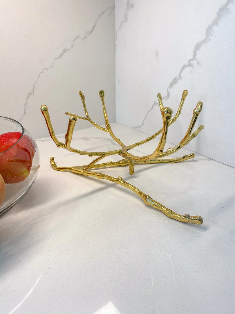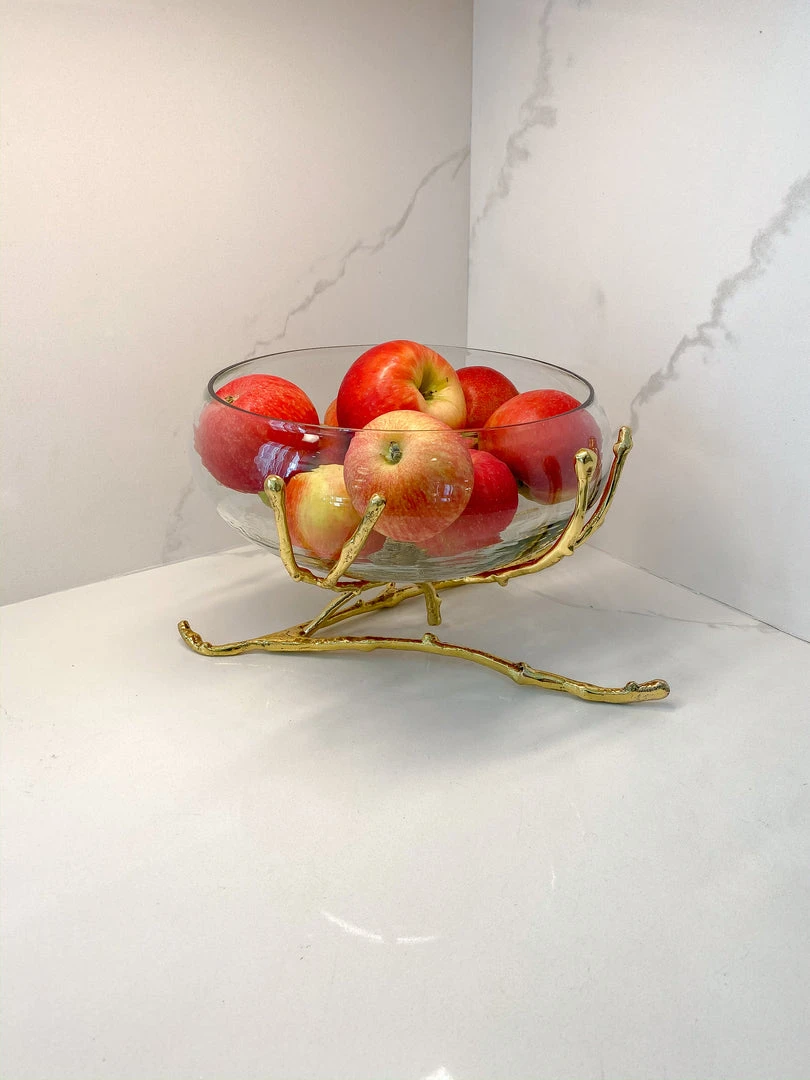 Description: This large glass bowl with a gold twig base, comes with a clear dimpled bowl to add in your favorite fillers. This would make a perfect centerpiece for your dining table or coffee table.
