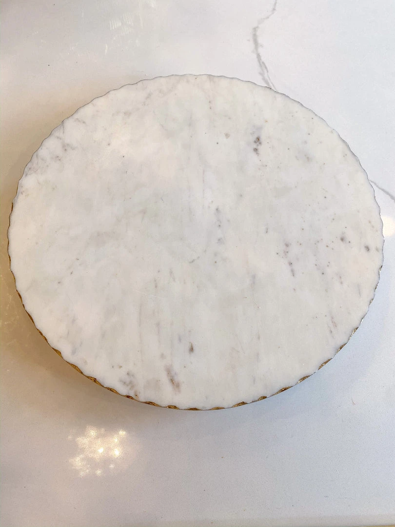 Description: This marble lazy Susan is very significant and features a stunning metallic gold edge. It is 16″ in diameter and is very large. This piece is perfect for your kitchen island or counters!