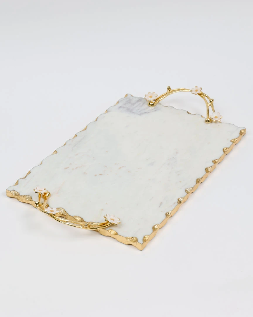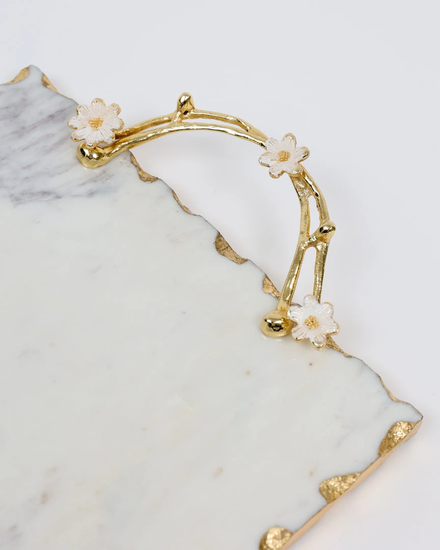 Description: This large rectangular marble tray has stunning gold detail and gold handles with a cherry blossom design!