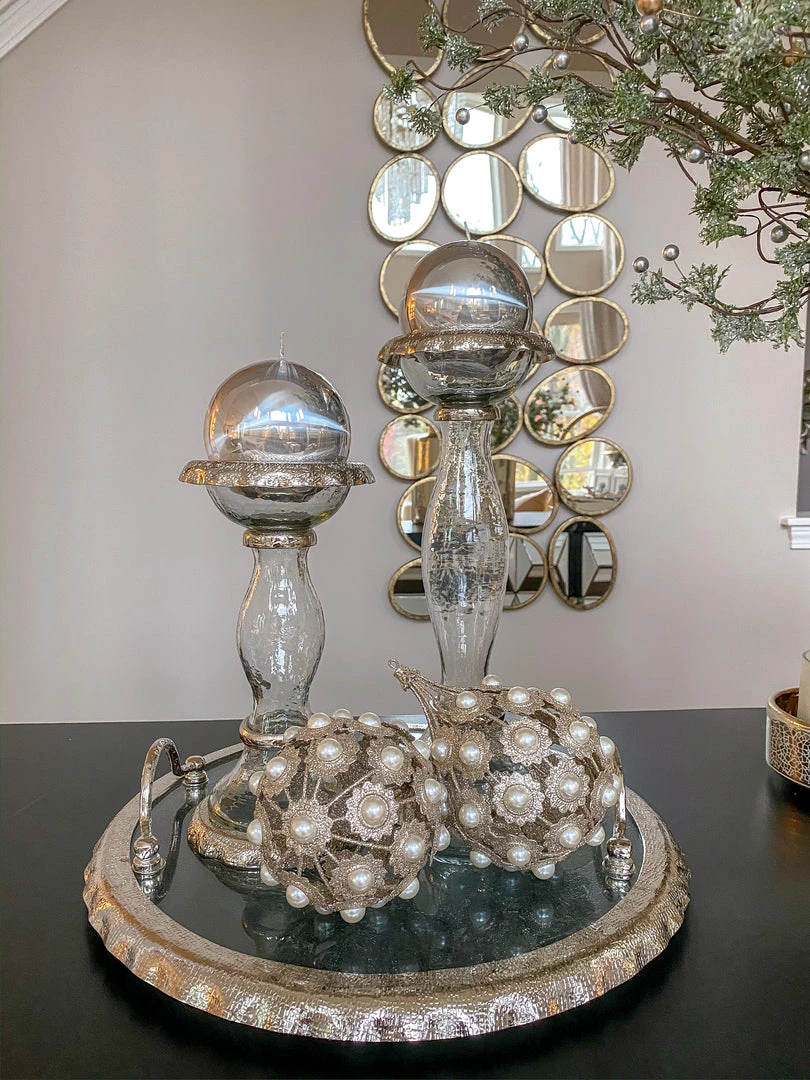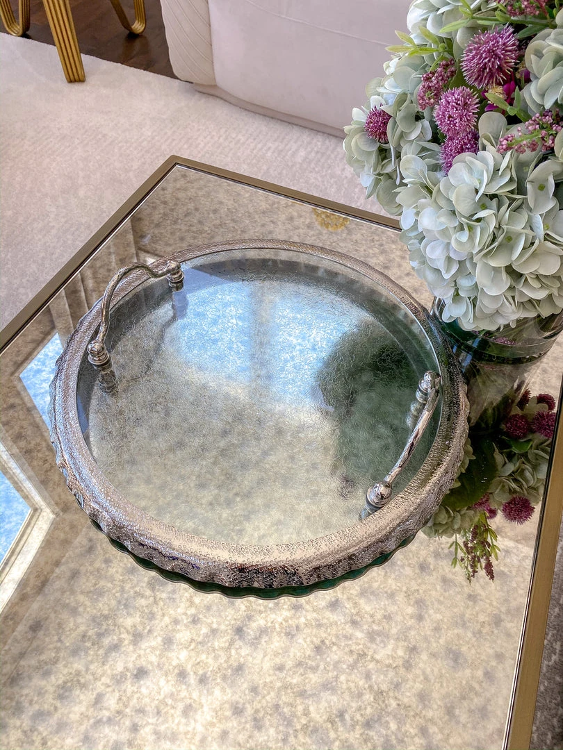 Description: This round glass tray features beautiful silver ruffle edging to elegantly display your decor.