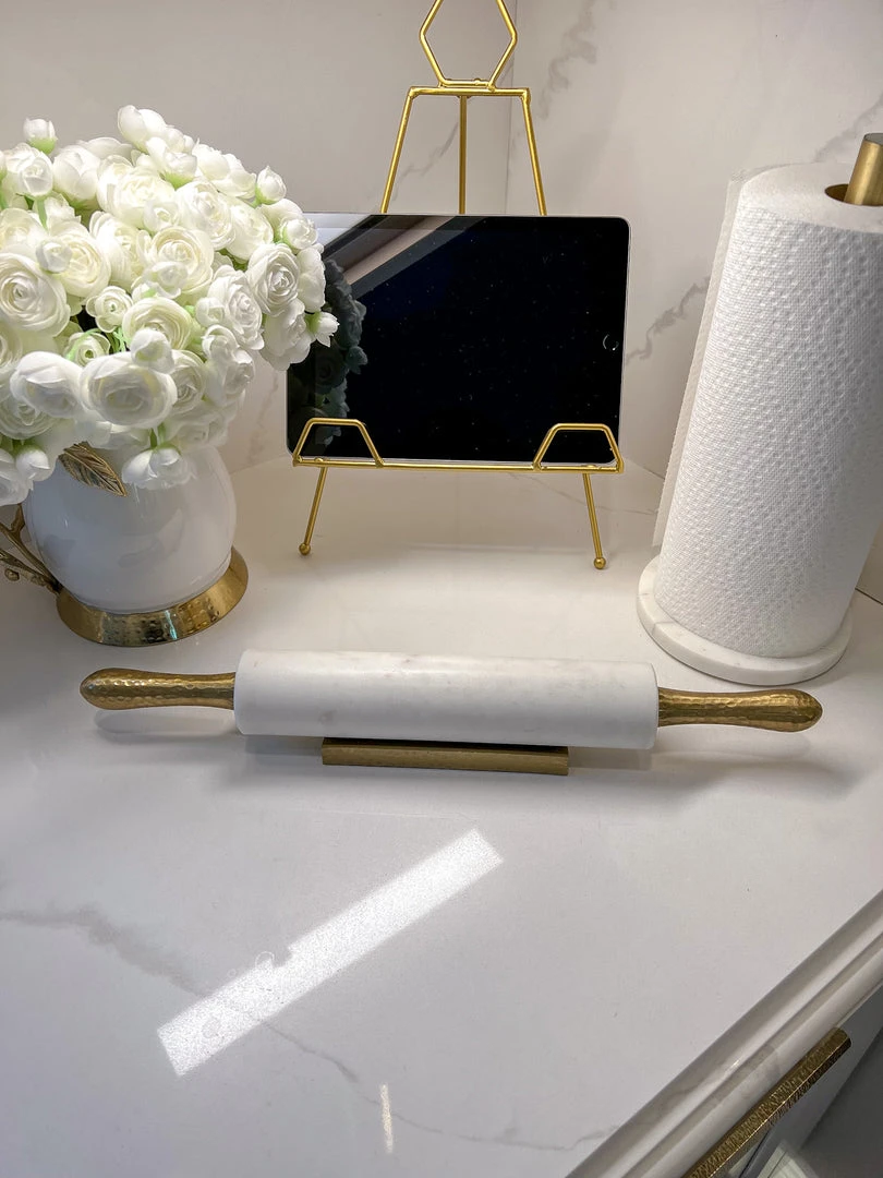 Description: This gorgeous marble rolling pin with gold hammered textured handles and base is so stylish. Perfect for using in baking or just makes the most beautiful display!