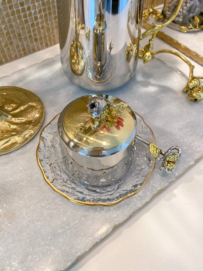 Description: This adorable sugar bowl features a stunning pomegranate topper on the lid! We love the two tone finish of this piece, as well as the beautiful details!