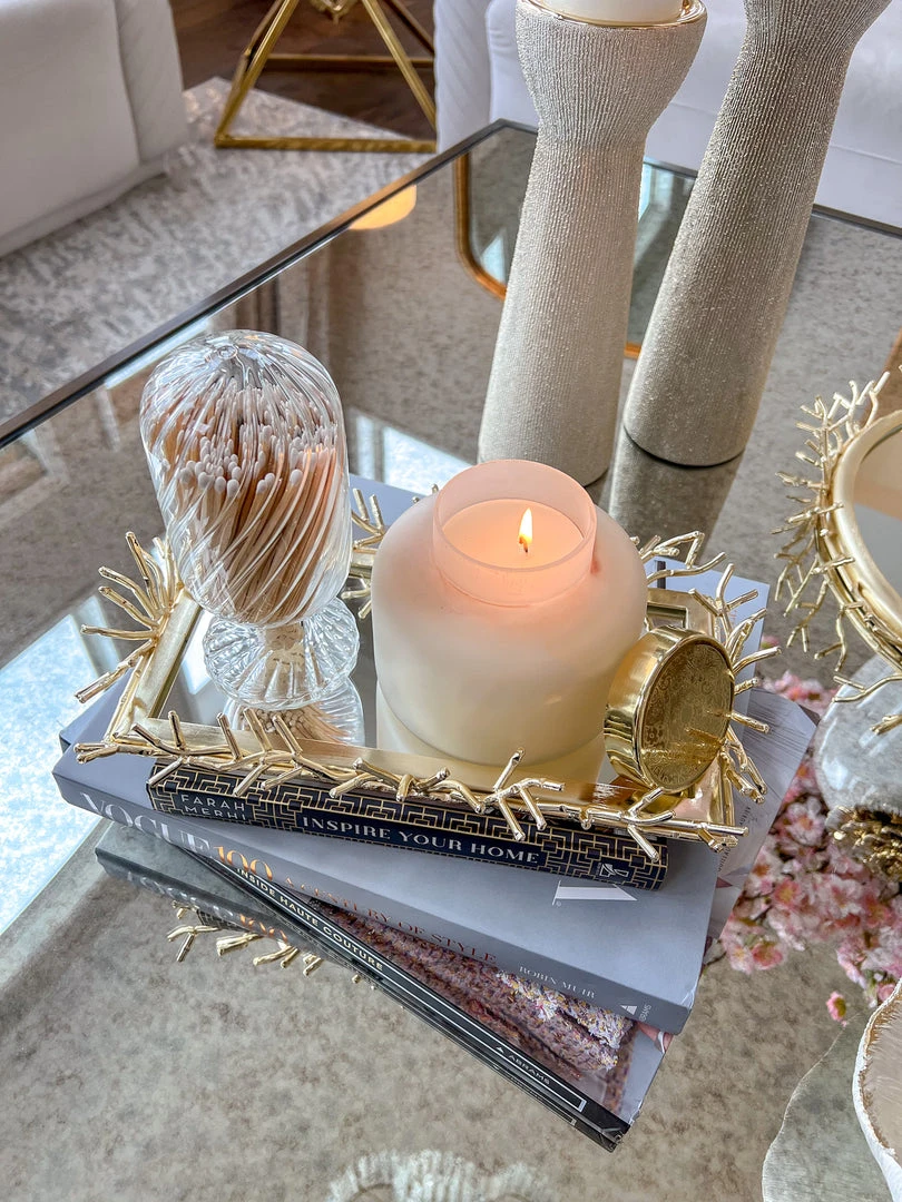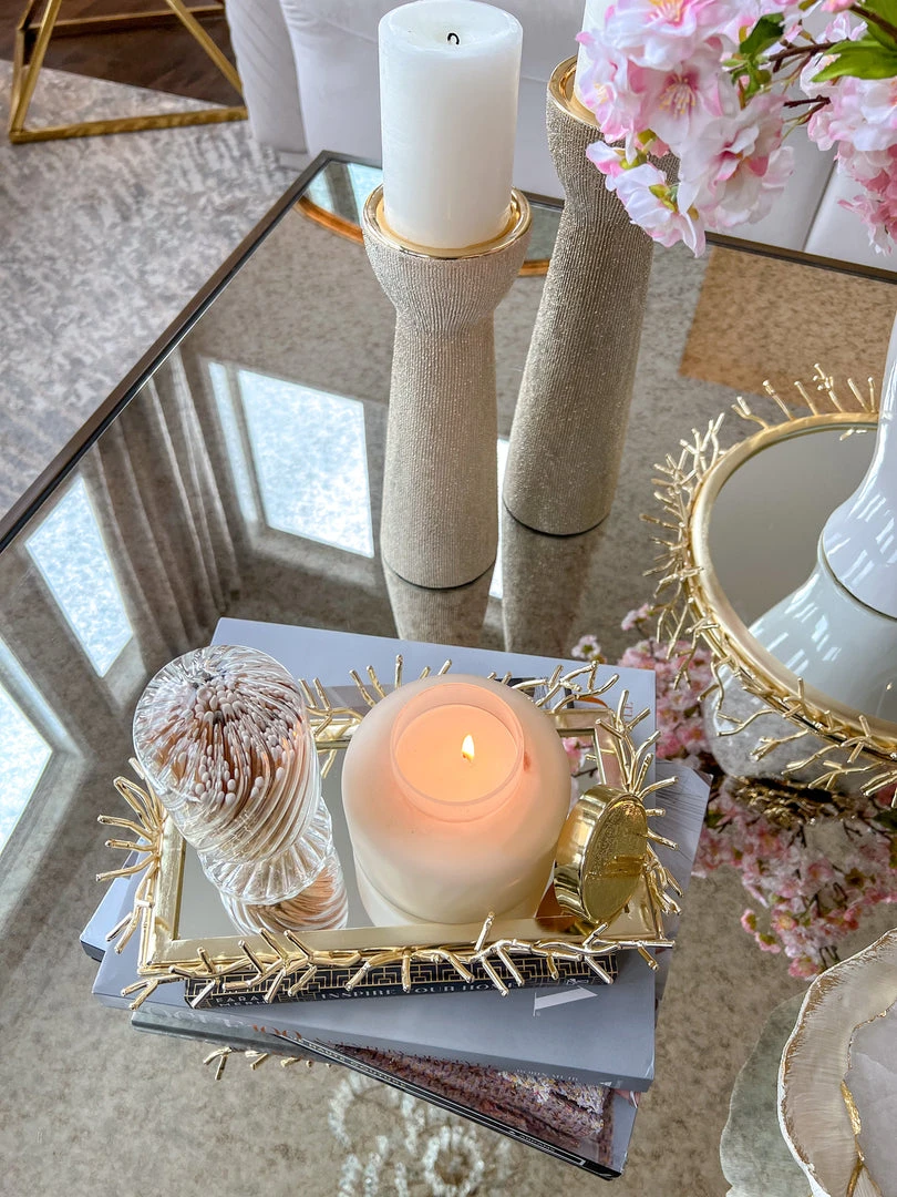 Description: This rectangle mirror tray features a fun textured border that will bring texture and glam to your decor! Perfect to layer with candles and matches!