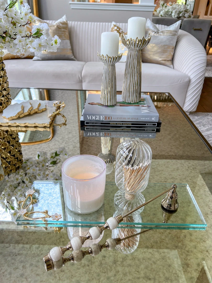 Description: This beautiful rectangular glass tray has stunning gold details with a cherry blossom design!