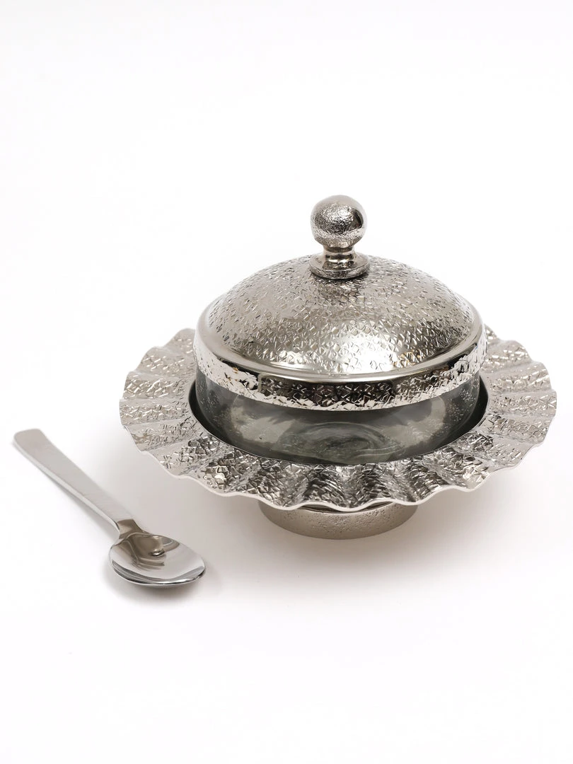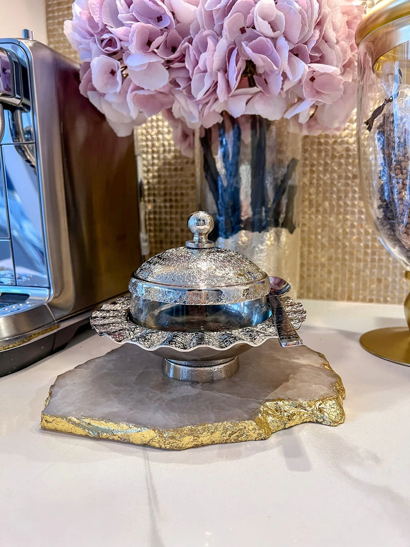 Description: This universal jar has a gold hammered lid and can be used for almost anything! It will be great for sugar, honey, jam, etc. Comes with a matching spoon.