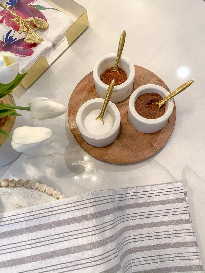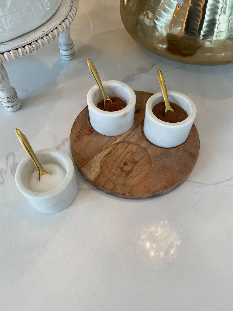 Description: These marble serving bowls are perfect for your favorite herbs and spices! Each set comes with three marble bowls with three gold spoons and a wood base to rest on.