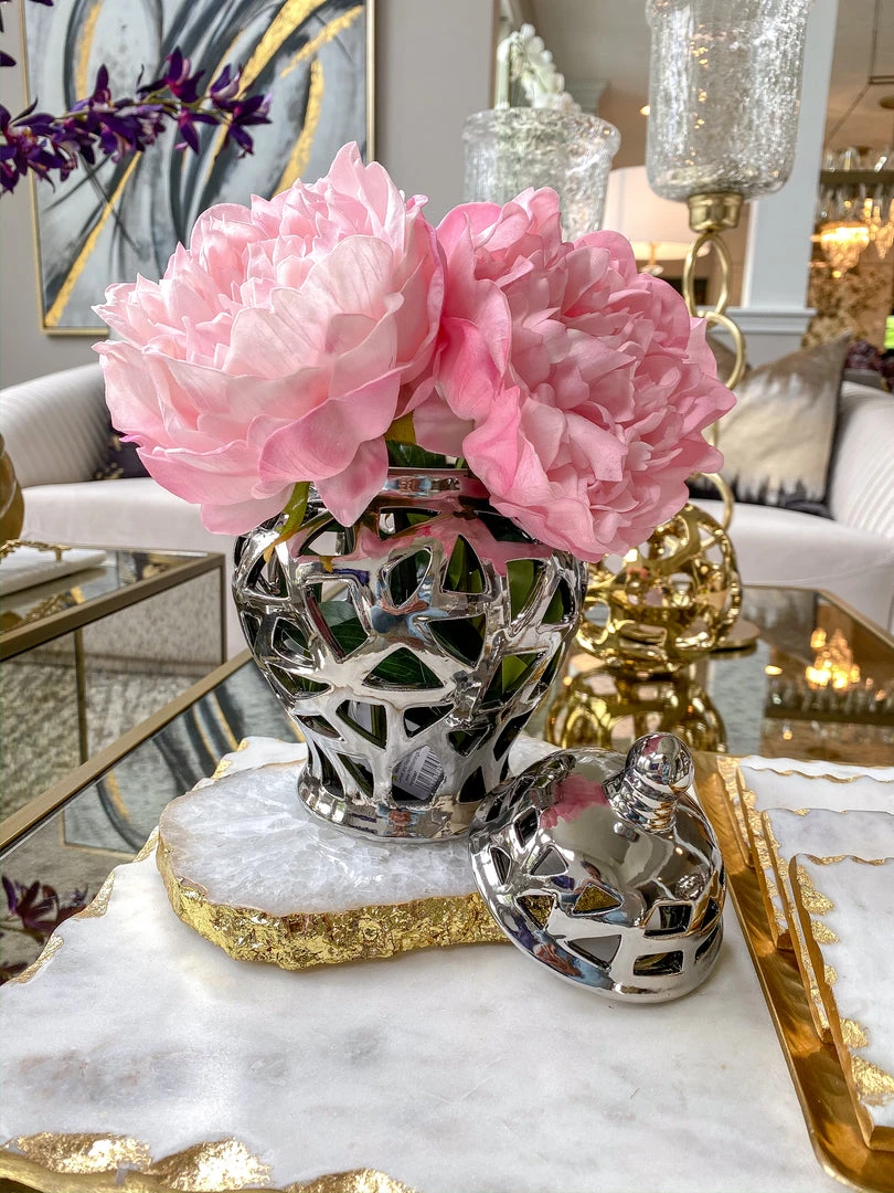Description: Want the classy look of a ginger jar but don’t have the space? This extra mini silver ginger jar is perfect for you! Standing at only 9.5 inches tall, this is perfect for tabletop decor, or will make a great detail on a desk in your office space! Classic elegance at the smallest scale!