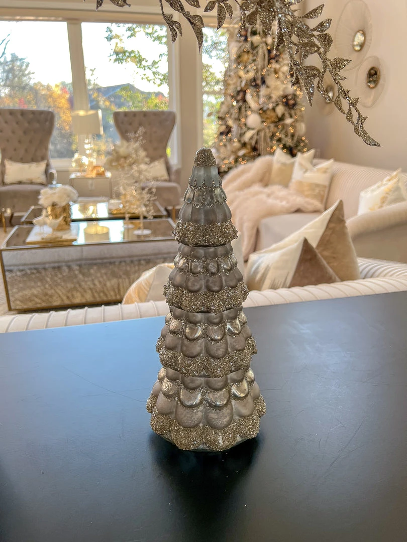 Description: This mercury glass tree with its neutral silver and gold coloring and beautiful glitter finish will instantly elevate any table or shelf as it shimmers in the light effortlessly.