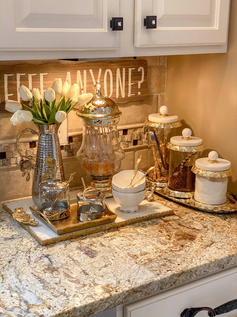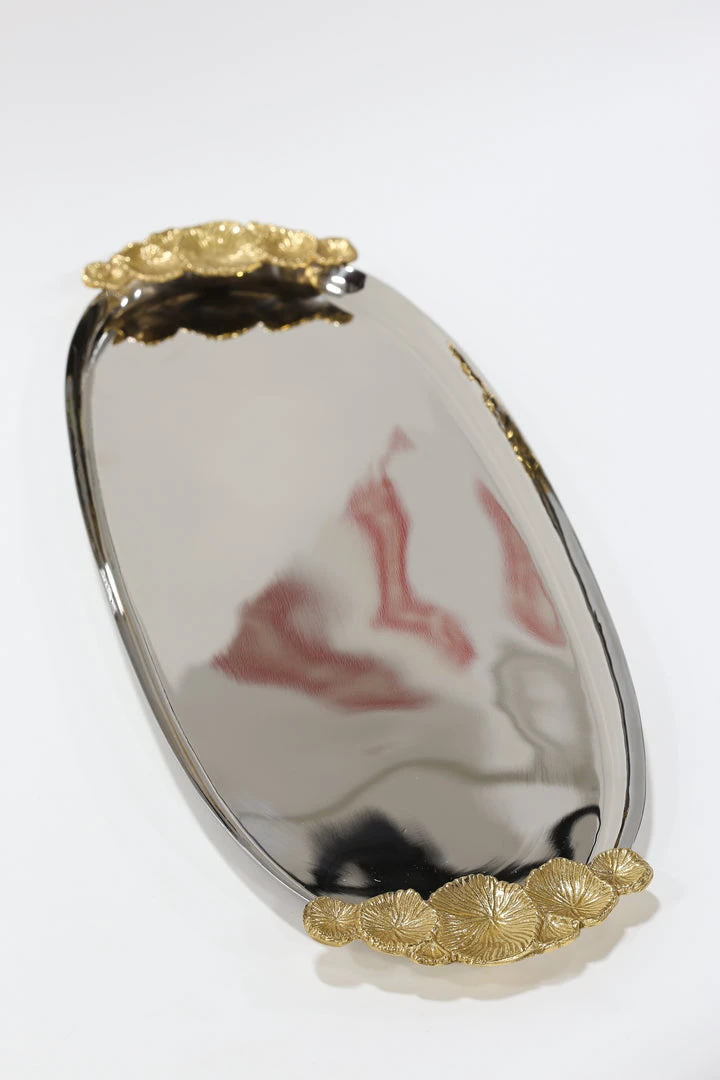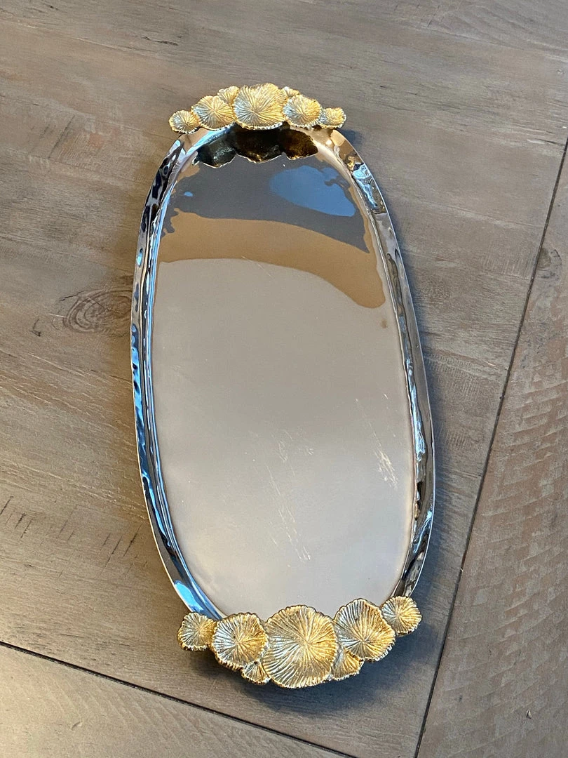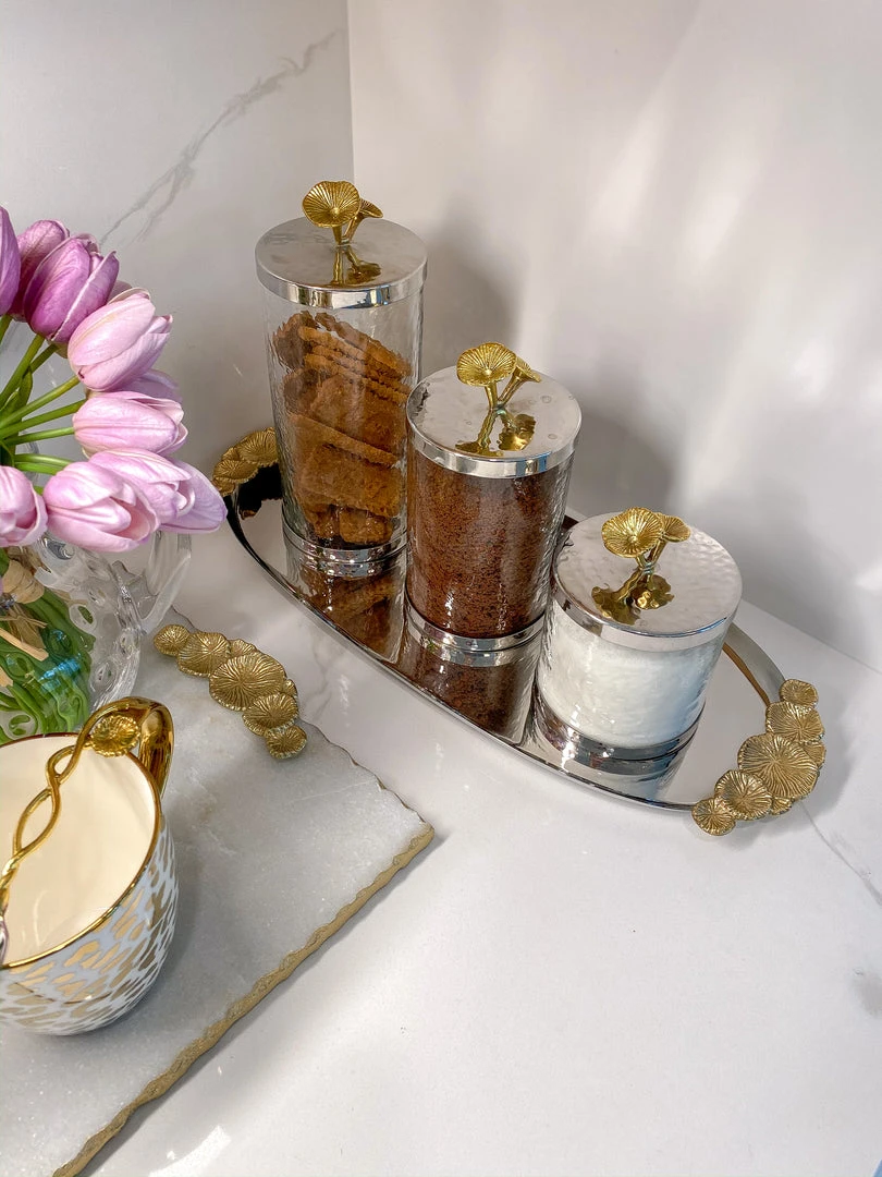 This stainless steel oval tray features gold floral handles and is a perfect home for your marble and gold hammered jars or your hammered lid glass jars.