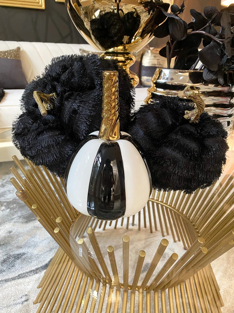 Description: This striped, black and white pumpkin with gold stem is a fun piece to add to your fall decor!