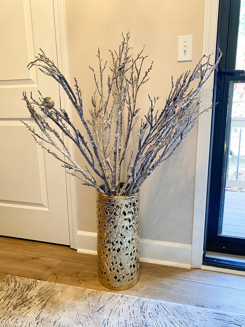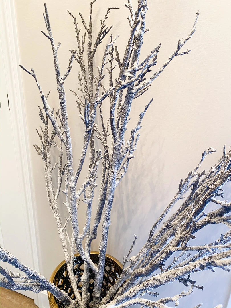 This branch is covered in “snow” for a wintery and elegant look. It is a very substanial size to style on a floor vase next to your fire place or entryway!