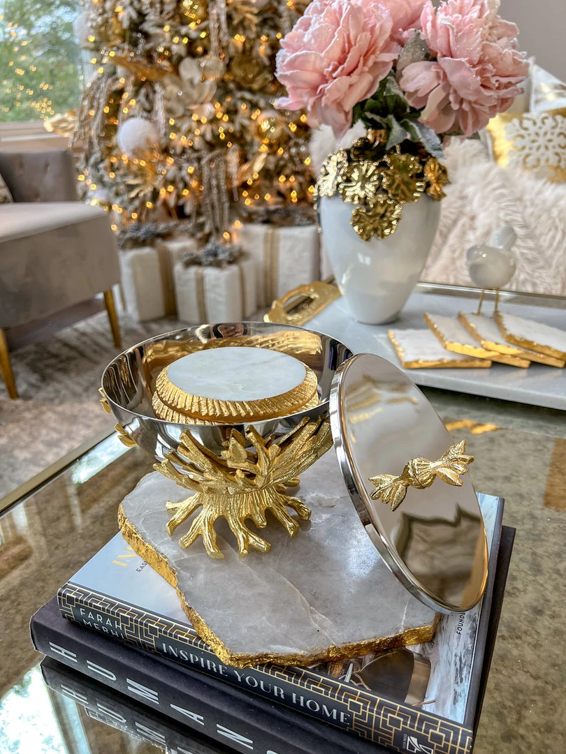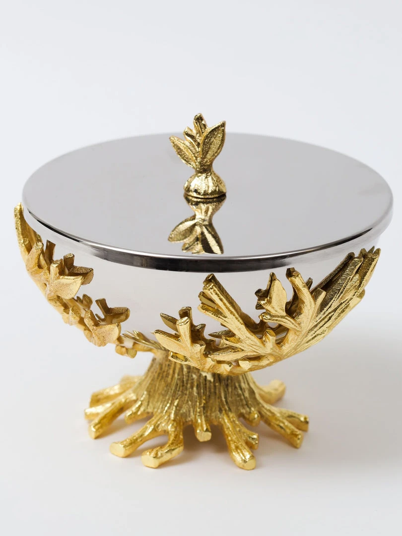 Description: This stunning dual-tone bowl features a lid and a beautiful gold branch base. The bowl is removable for easy cleaning.