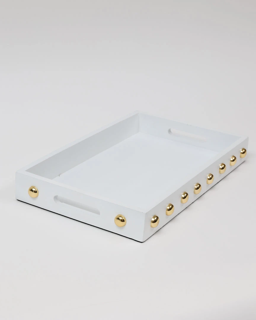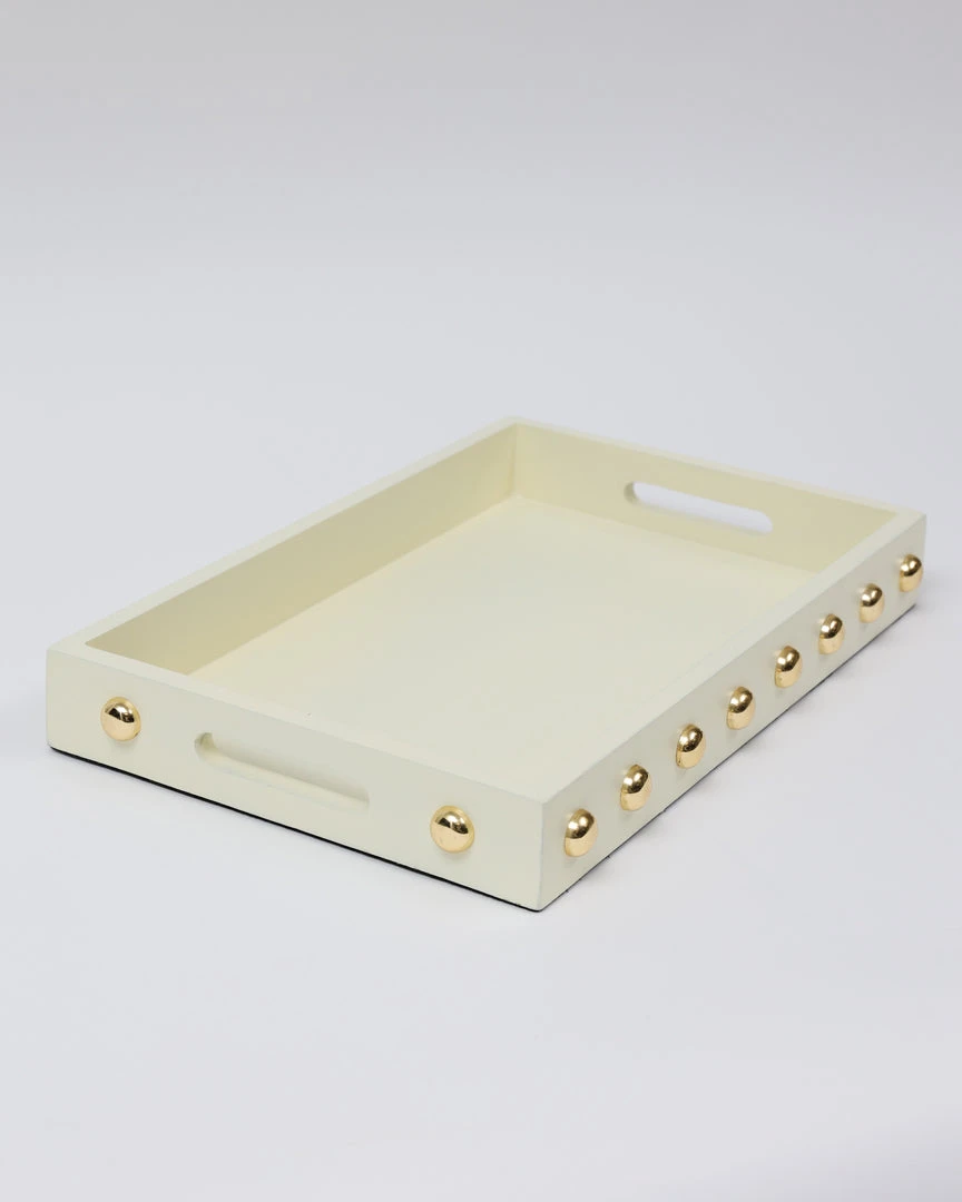 Description: This wooden tray with its shiny gold studs is a statement maker.