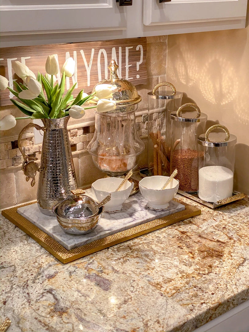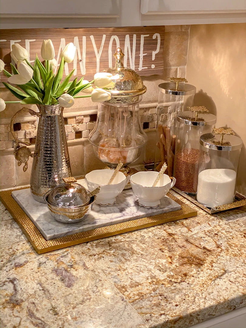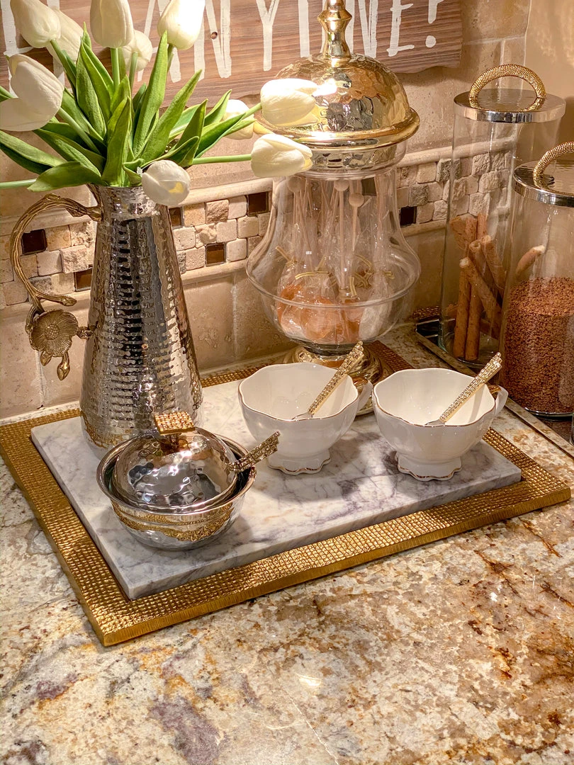 Serve sugar, honey and or jam in this pretty hammered bowl. Metal on the outside with a glass insert for easy wash and a mosaic spoon!Â