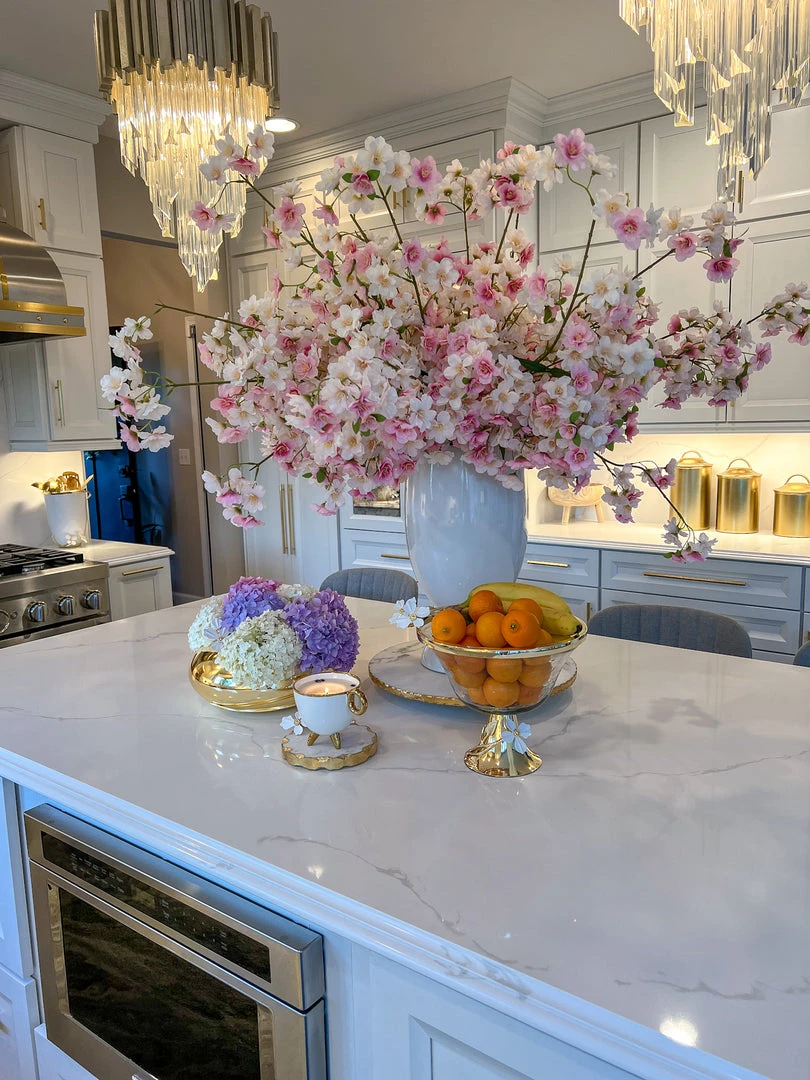Description: This gorgeous bowl will become your favorite fruit bowl or use it to display your favorite florals. The gorgeous white jeweled flower details ties back to the entire collection.