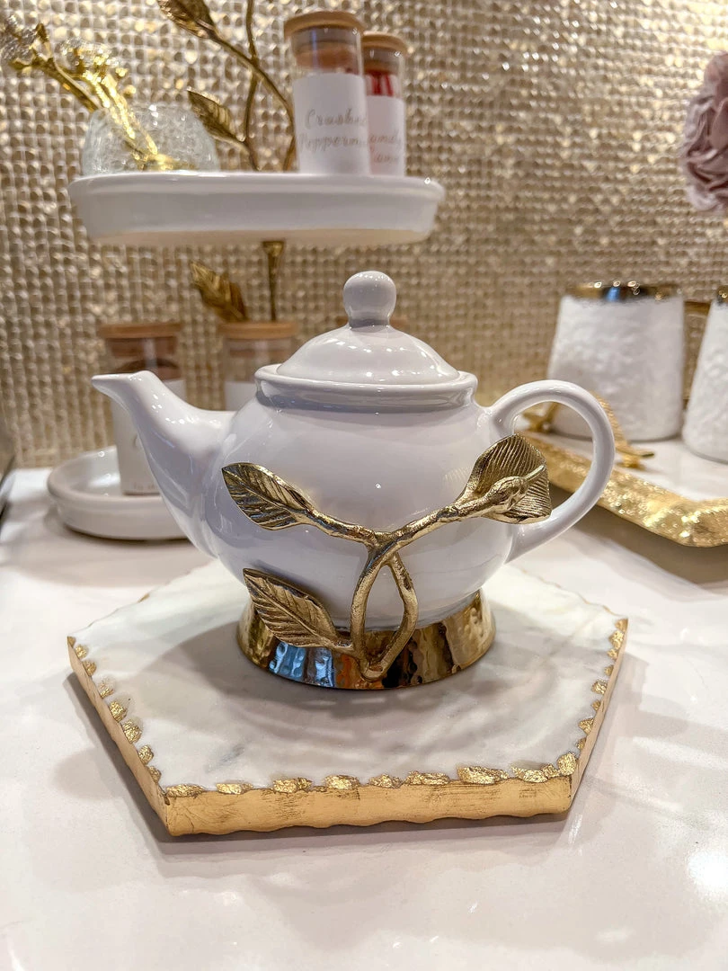 Description: This tea pot will make an elegant setting for tea time. The is a beautiful white design with gold leaf details and a gold base.Â
