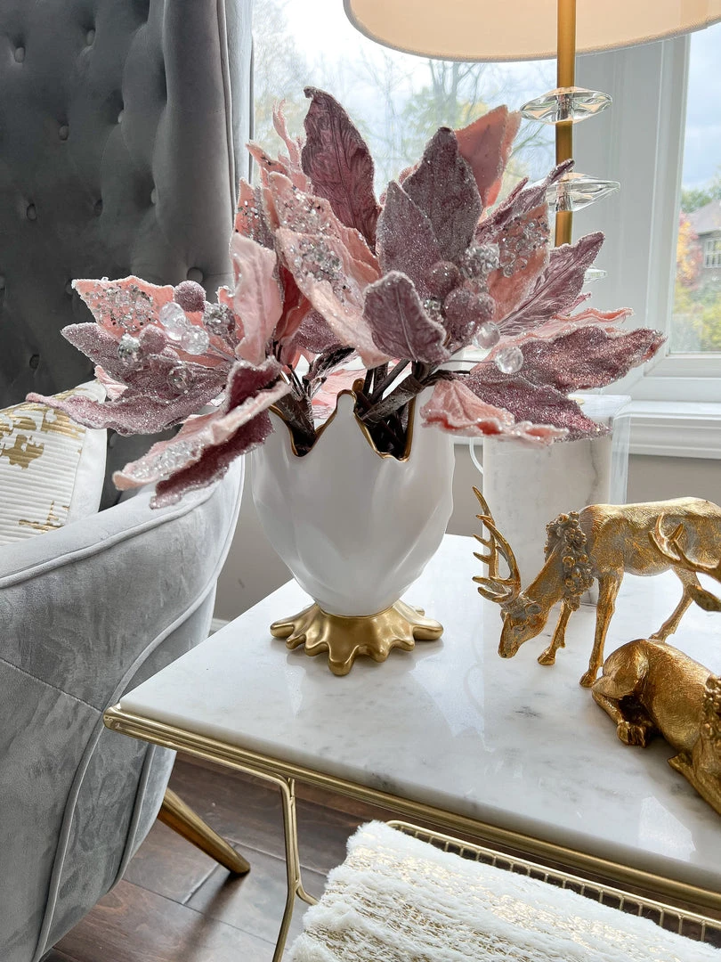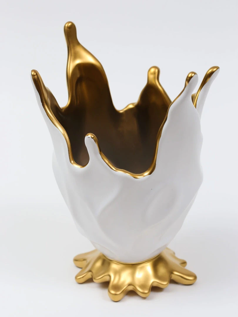 Description: This white and gold vase has a beautiful and unique style! You can style it on top of a tray and empty or you can add faux floral in the vase.