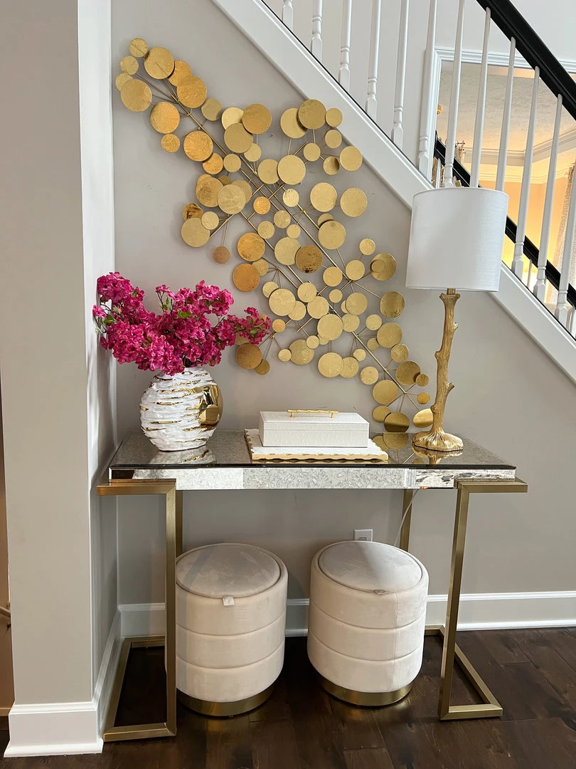 Description: This white and gold textured vase will bring some interest to any vingette! It ties back beautifully to our white and gold textured bowl if you want a matching pair!